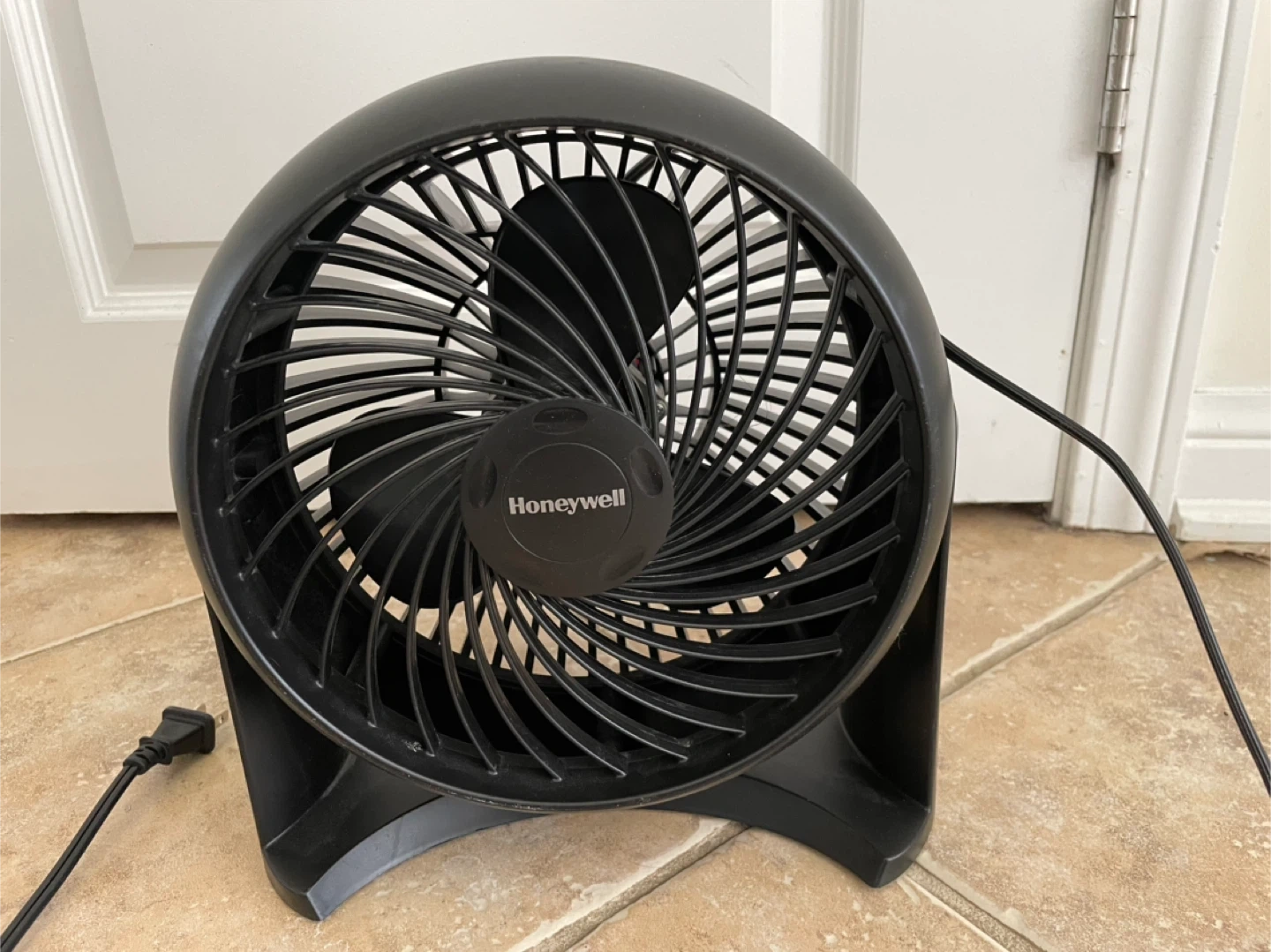 This is a black Honeywell turbo fan. It has a round grill and a sturdy base. It features multiple speed settings. It's a compact fan that's great for a desk or small room.