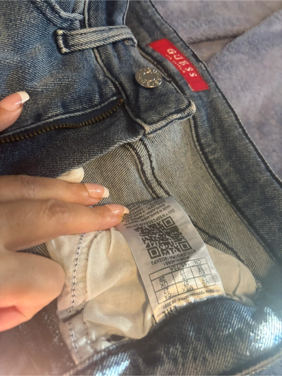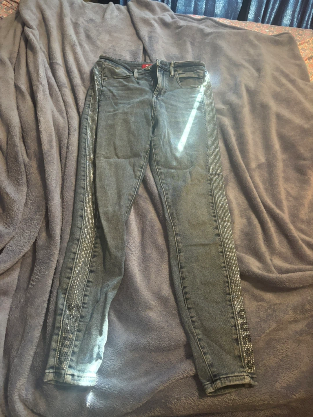 Stylish Guess skinny fit jeans with rhinestone detailing along the side seams. Features a mid-rise waist and a classic five-pocket design. These jeans are a size 27