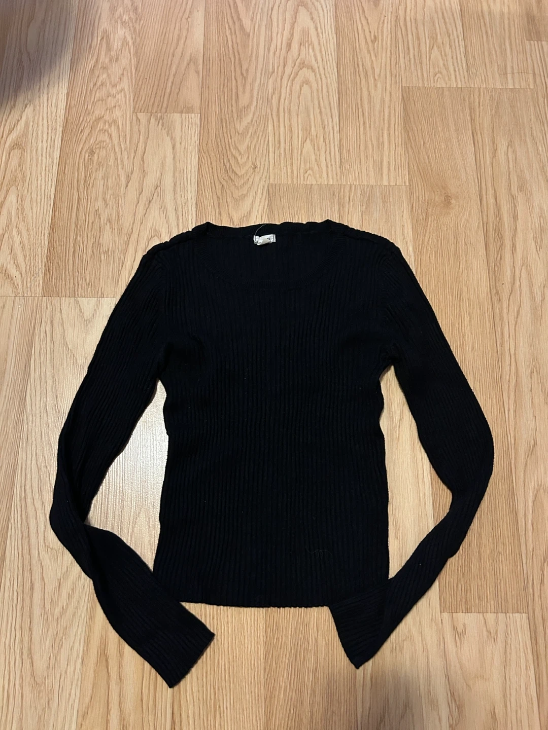 A black ribbed long-sleeve top - size xs. It's made of a soft knit material and has a comfortable fit. This top is great for layering or wearing on its own.