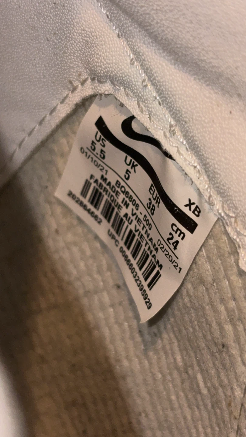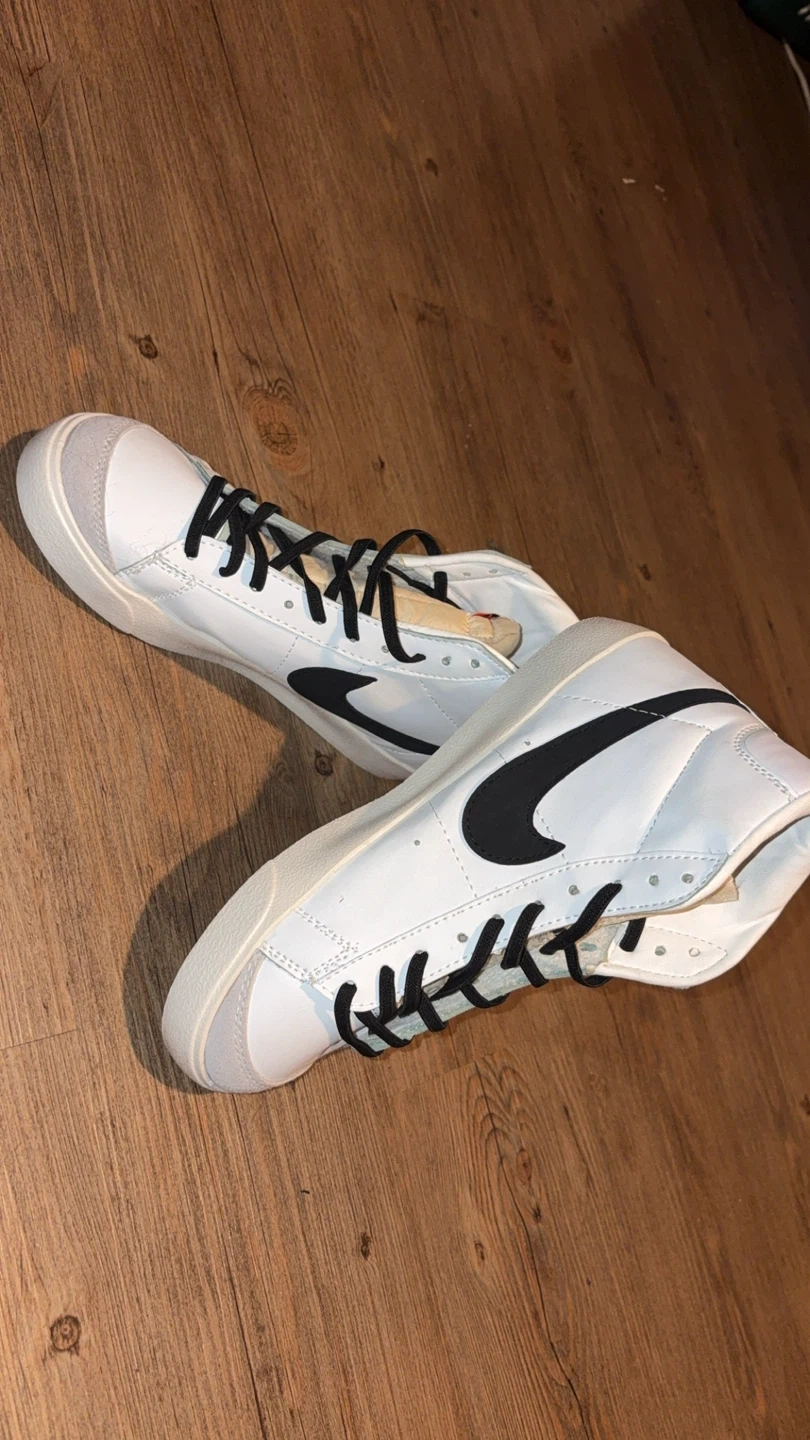 These Nike Blazer Mid '77 Vintage sneakers are white with black accents. They feature a classic high-top silhouette. Size 5.5 US women's.