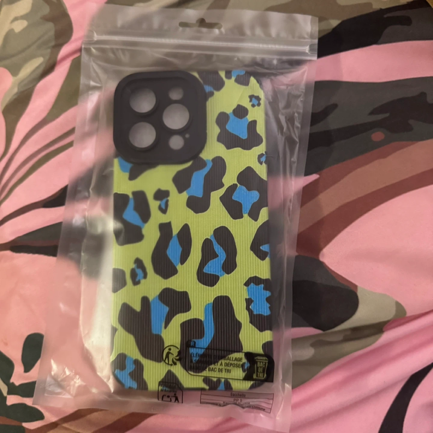 New iPhone 14 Pro Max case with a bright neon leopard print. It's designed to fit the iPhone 14 Pro Max model. This case offers protection for your phone.