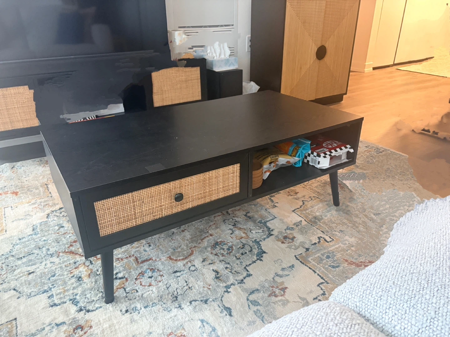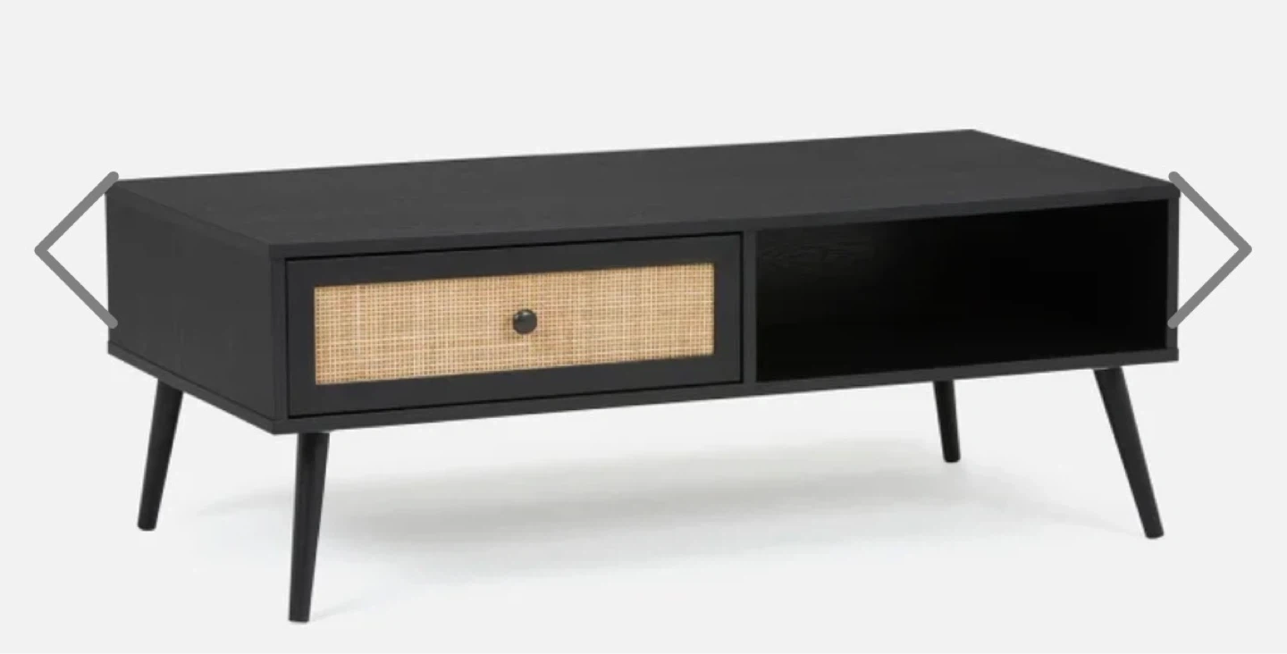 Black coffee table 110cm featuring a rattan drawer front and an open shelf. It has mid-century modern tapered legs. Dimensions are approximately 40" L x 20" W x 16" H.