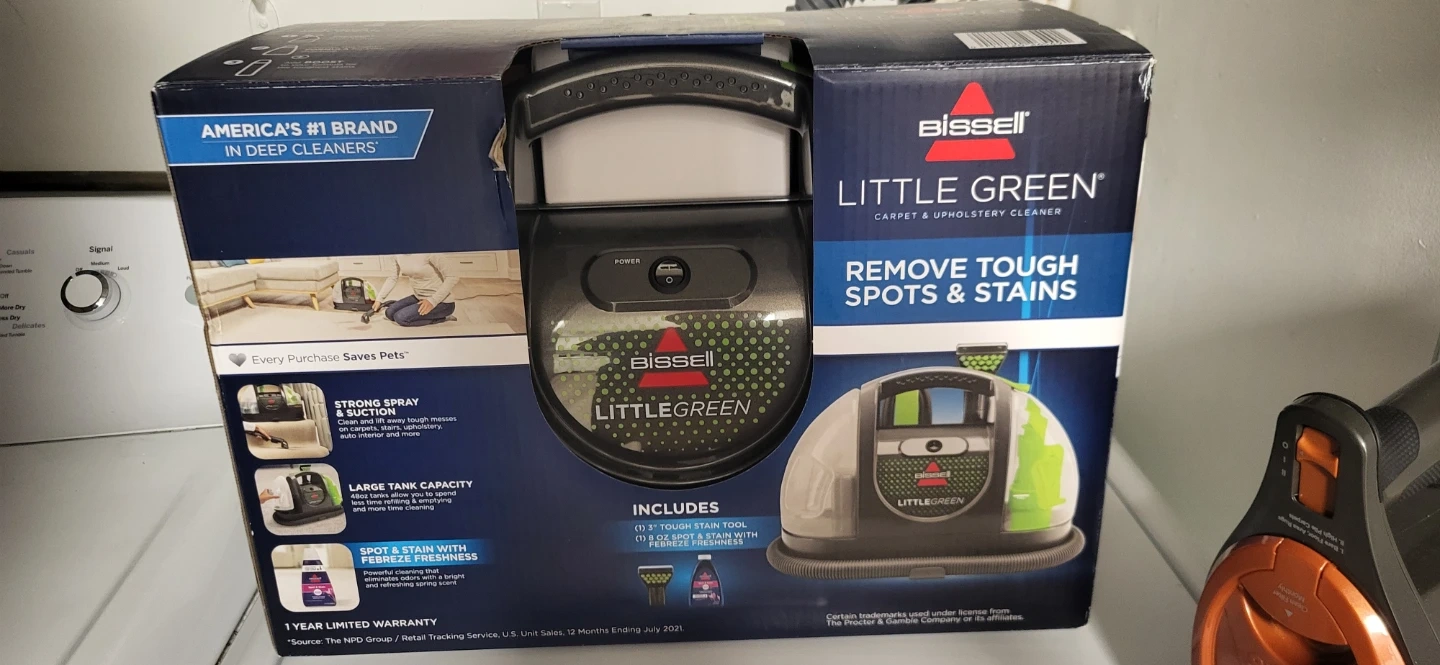This is a Bissell Little Green carpet and upholstery cleaner. NEVER OPENED OR USED. It features strong spray and suction to remove tough spots and stains. It also has a 48oz tank capacity and includes a 3" tough stain tool.