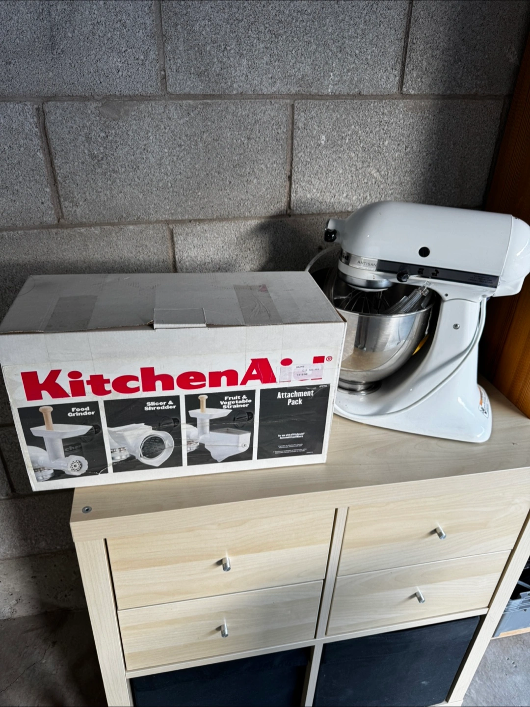 Selling a KitchenAid Artisan stand mixer! It comes with the attachment pack including the food grinder, slicer & shredder, and fruit & vegetable strainer. The box is included and contains all the components. This is a great addition to any kitchen!