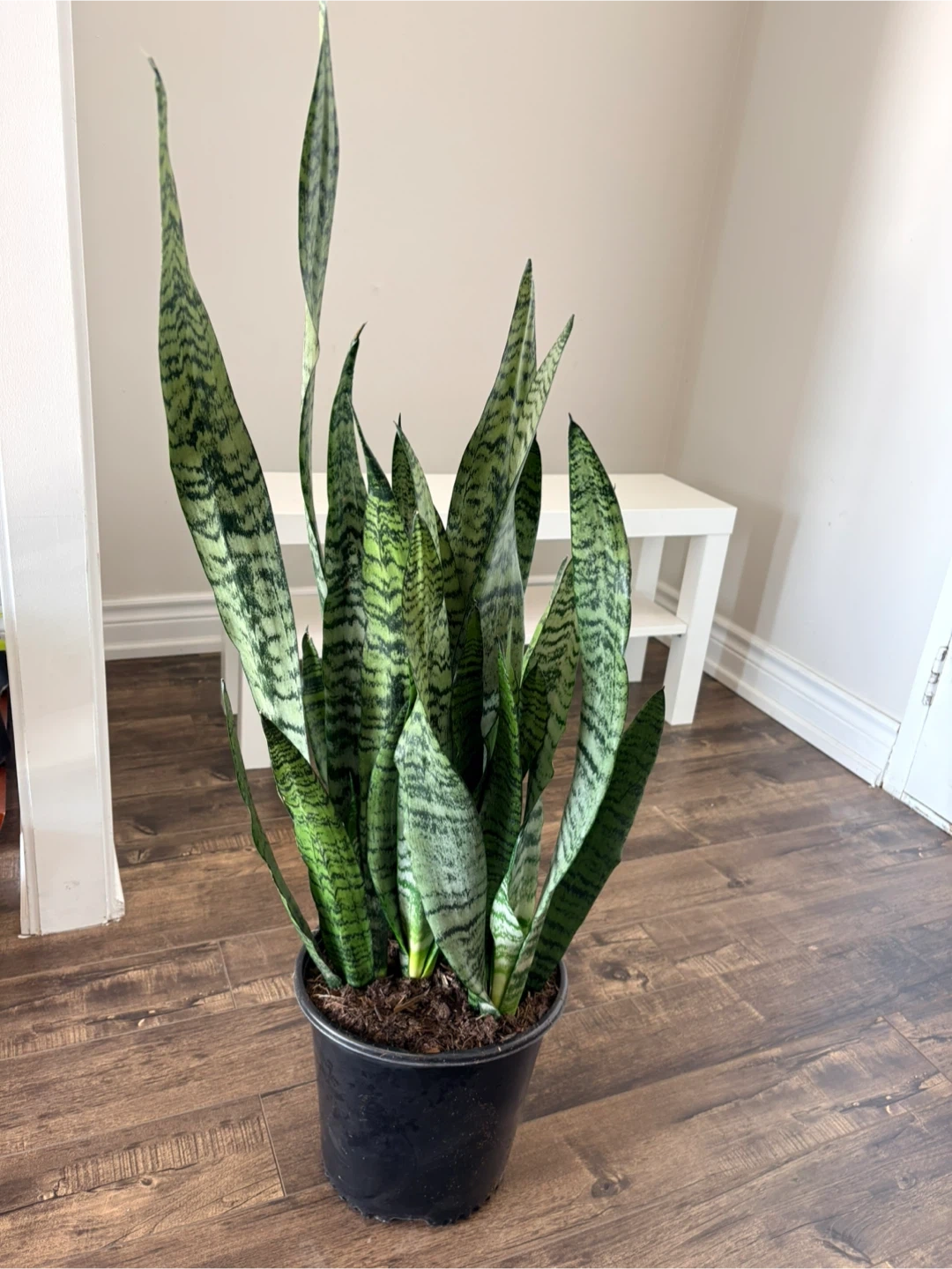 Healthy snake plant in a black plastic pot. It's known for its air-purifying qualities and low maintenance needs. This plant thrives in various light conditions, making it a versatile addition to any home.