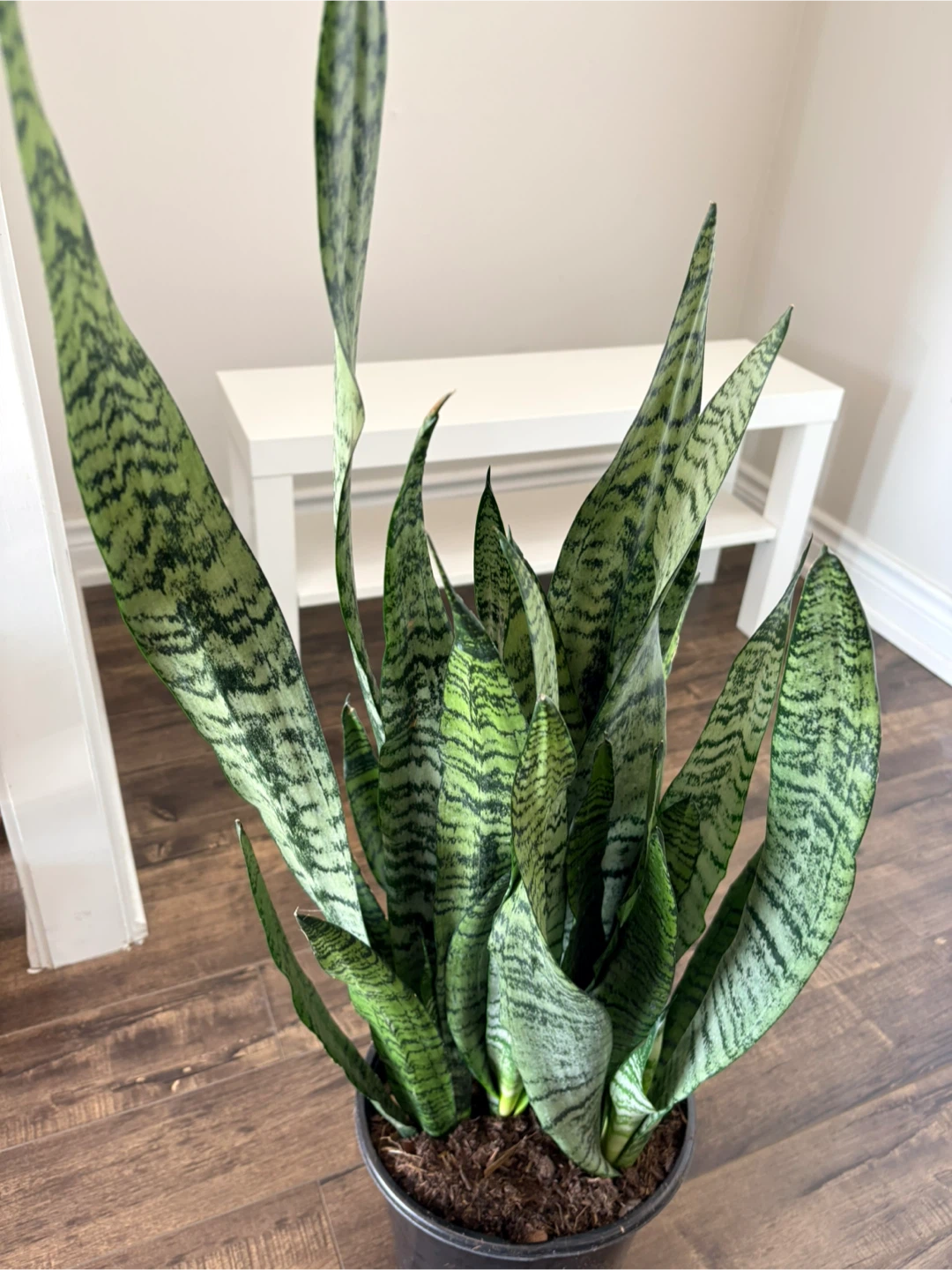 Healthy snake plant in a black plastic pot. It's known for its air-purifying qualities and low maintenance needs. This plant thrives in various light conditions, making it a versatile addition to any home.