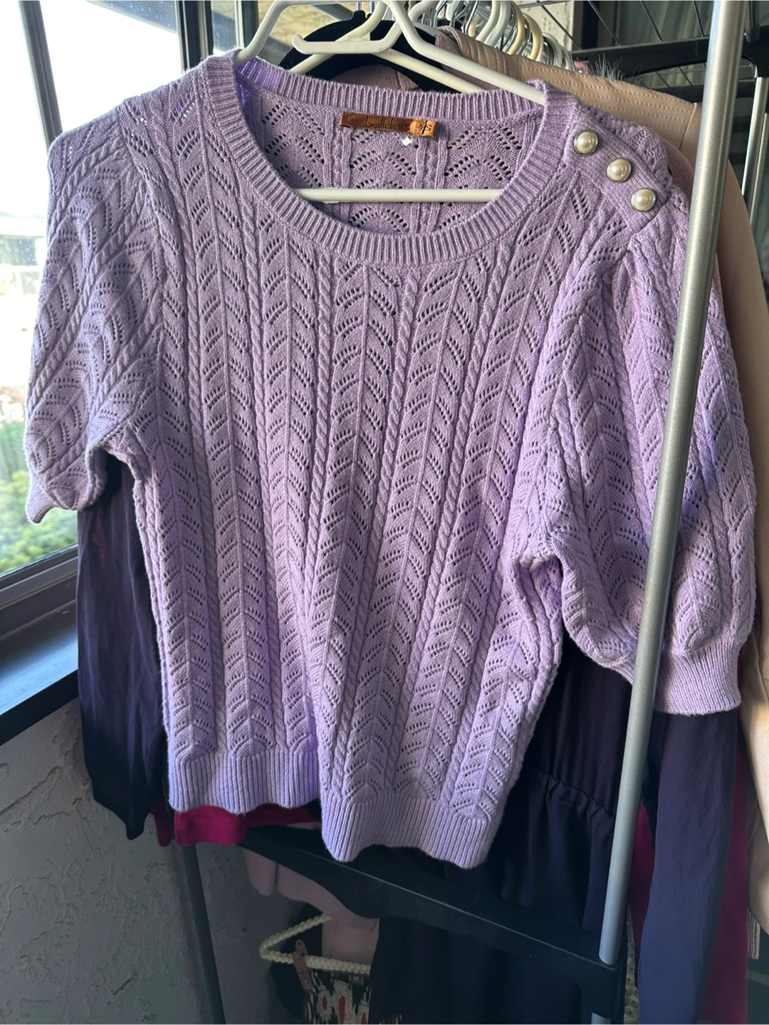 Selling a Belldini knit top in a lovely light purple colour. It's a size small and features a unique knit pattern. The top has short sleeves and pearl detailing on the shoulders. Perfect for adding a touch of elegance to your wardrobe!