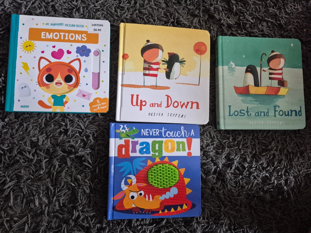 Two gently used children's board books. Titles available include *Up and Down*, *Lost and Found*. *Emotions* and *never touch a dragon* unavailable. Great for toddlers and preschoolers. Interactive elements in some books. $5 for both. Located in St Thomas