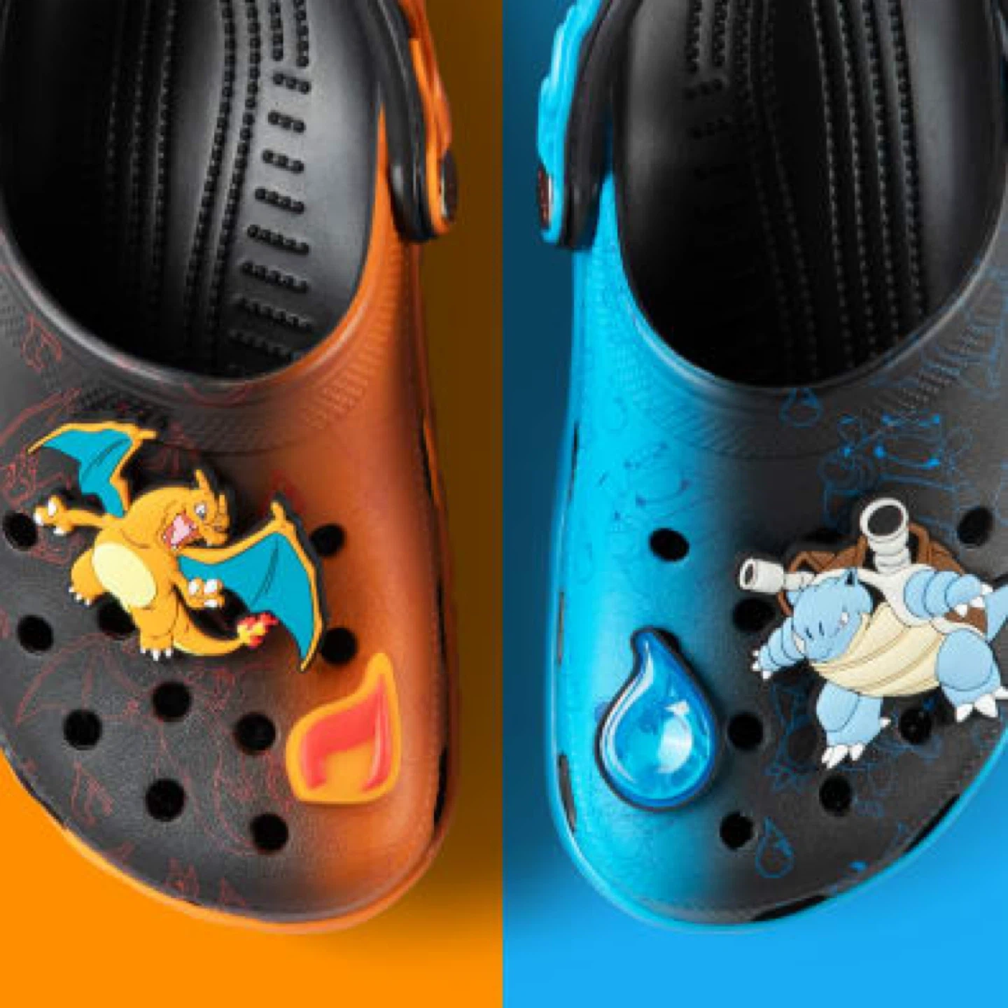 Selling a pair of Crocs clogs with Pokémon designs! One clog features Charizard with a flame Jibbitz, and the other features Blastoise with a water drop Jibbitz