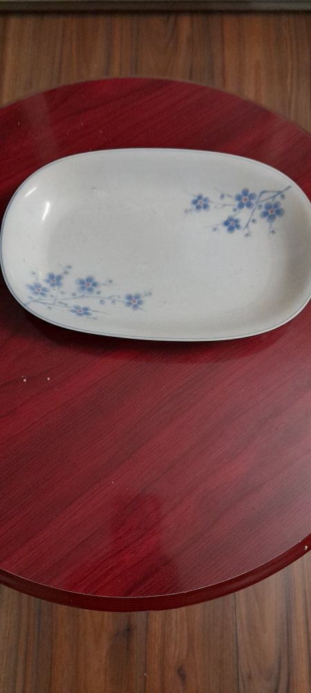 Small oval platter. Features a delicate floral pattern in blue and white. Perfect for appetizers or desserts.