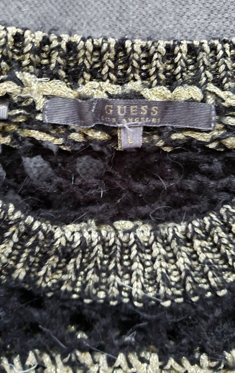 Women's GUESS sweater. Black and gold striped design. Size Large, relaxed fit. Knit material. Some gold thread inconsistencies due to nature of thread.