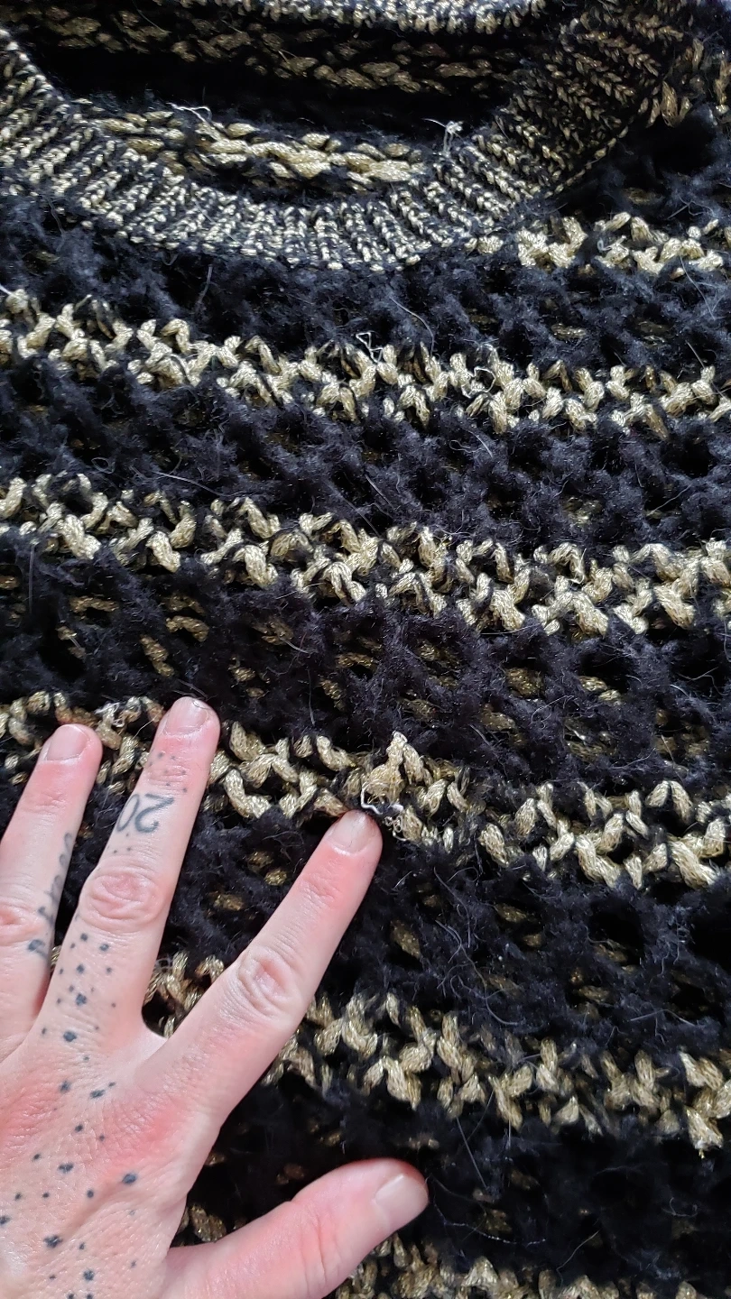 Women's GUESS sweater. Black and gold striped design. Size Large, relaxed fit. Knit material. Some gold thread inconsistencies due to nature of thread.
