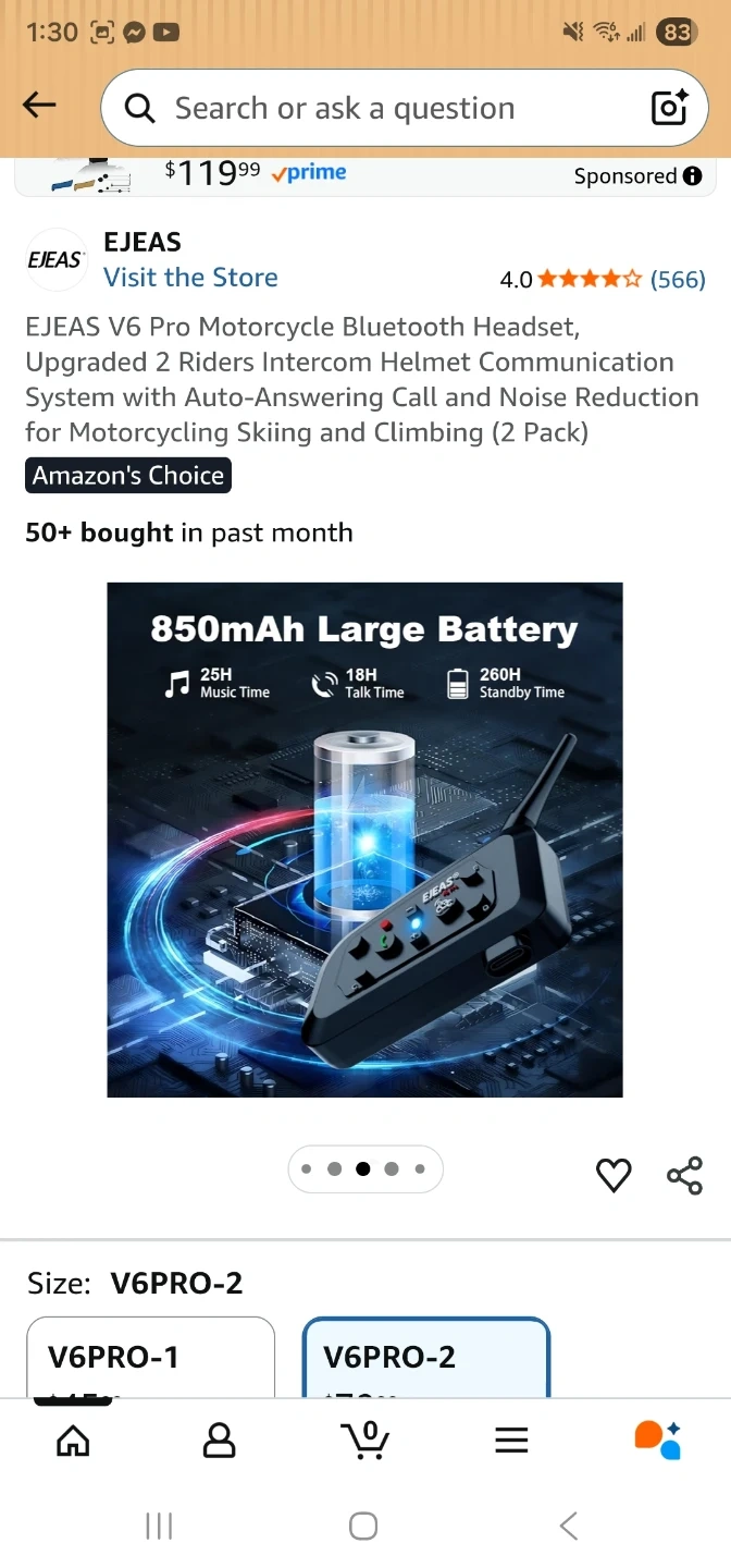 EJEAS V6 Pro Motorcycle Bluetooth Headset, upgraded for 2 riders. It offers real-time intercom and noise reduction. It's IP67 waterproof with an 850mAh battery. This headset supports auto-answering calls and GPS navigation.