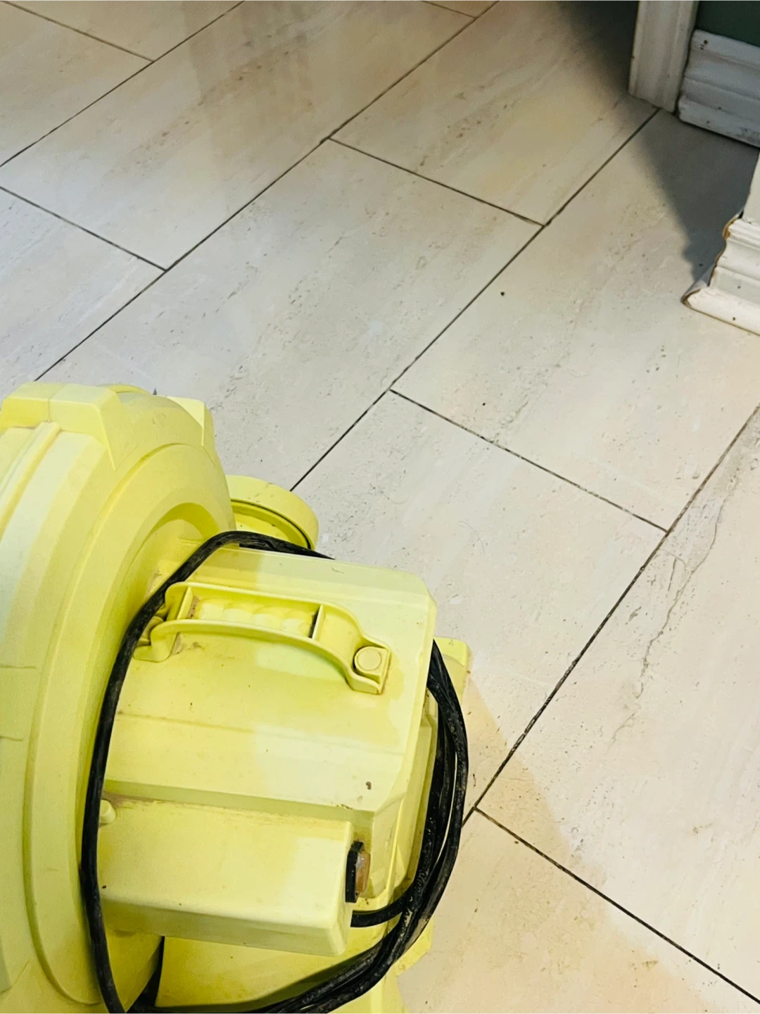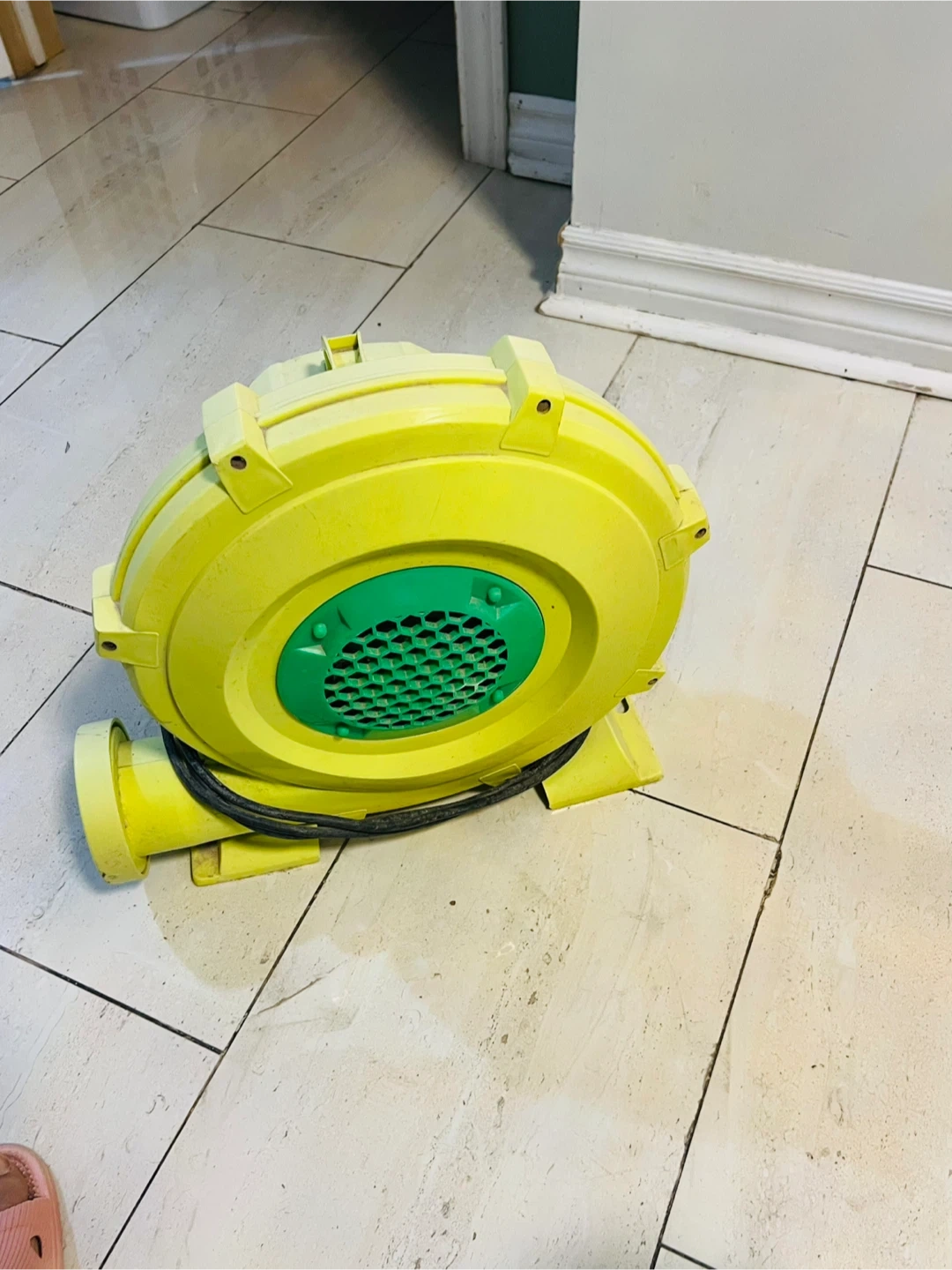 This is a yellow blower fan, commonly used for inflatable structures. It features a durable plastic casing and a powerful motor. The fan includes its power cord for immediate use. It's great for parties or events where inflatable attractions are used!