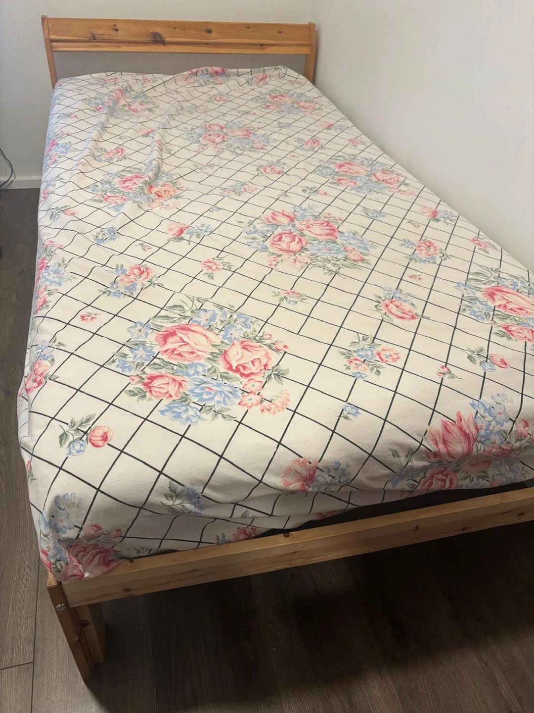 This is a simple wooden bed frame + Mattress with a floral print duvet cover. It's a single-sized bed. The wood is a light pine colour. This bed would be suitable for a child's room or a guest room.