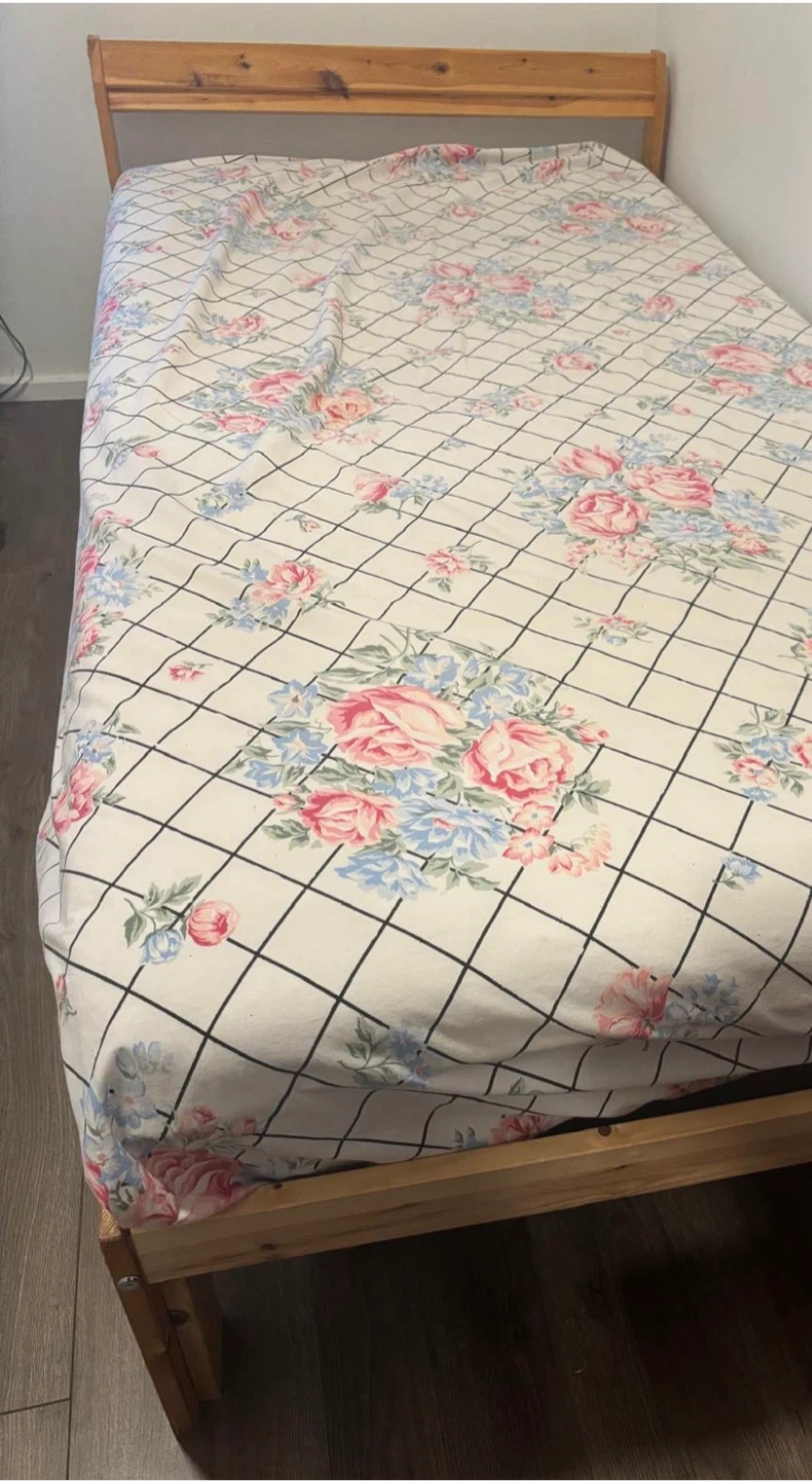 This is a simple wooden bed frame + Mattress with a floral print duvet cover. It's a single-sized bed. The wood is a light pine colour. This bed would be suitable for a child's room or a guest room.