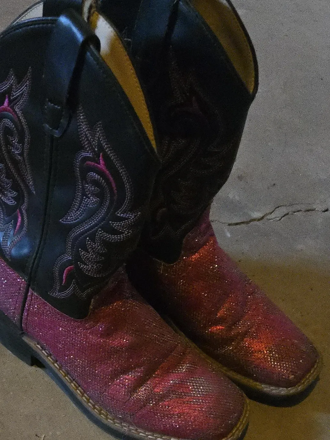 Cute glitter cowboy boots for kids! They feature a sparkly pink foot with black shafts and pink embroidery. Perfect for your little one's Western adventures. Easy to slip on and off.