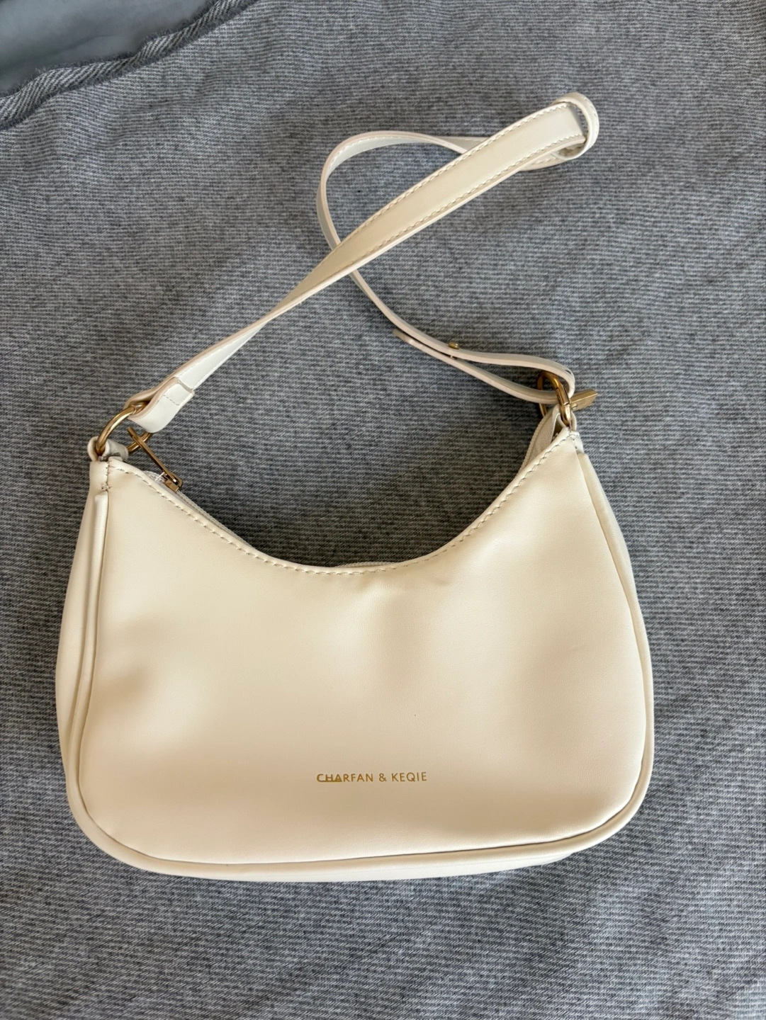 Adorable off-white half-moon bag. Features a long strap and gold-toned hardware. Small interior zipper pocket. Zipper closure.