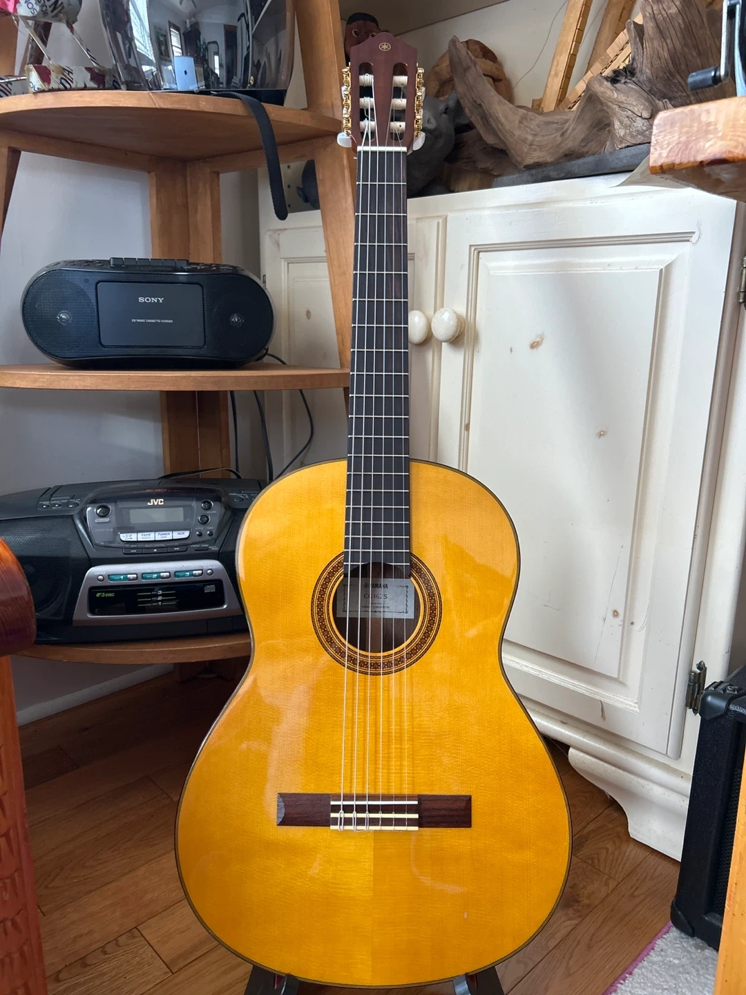 Yamaha CG162S classical guitar made in China. It features a natural finish and nylon strings. This guitar's neck is made of nato wood with a rosewood fingerboard. A nylon string instrument for beginners and intermediate players. Sound sample available upon request.