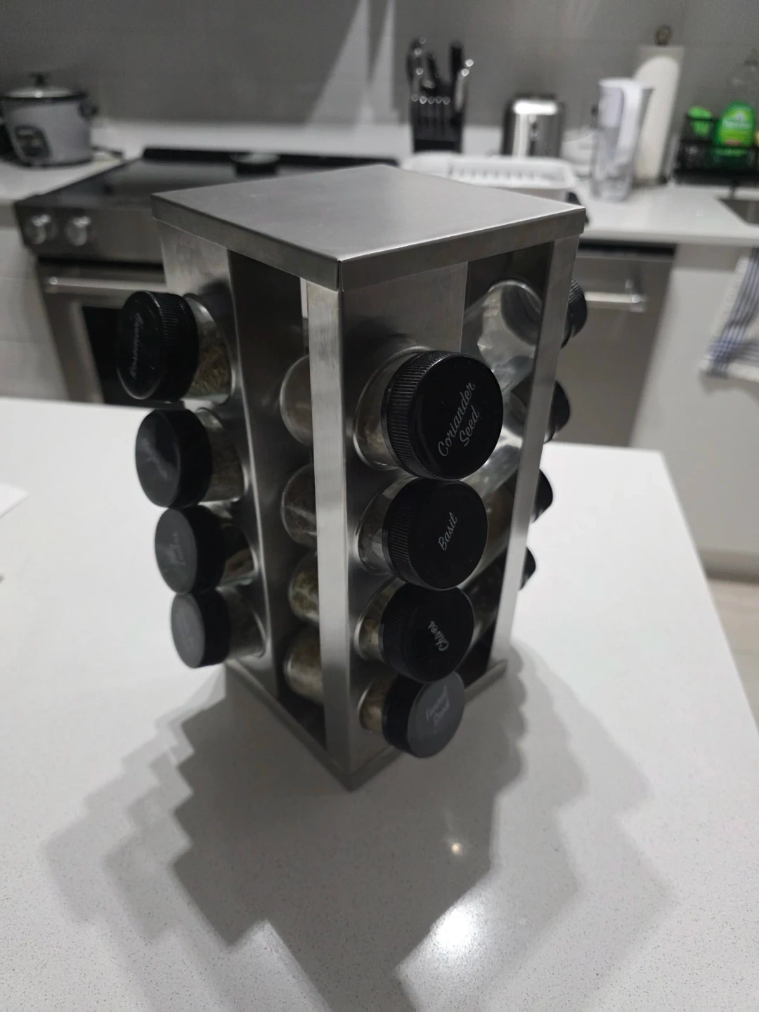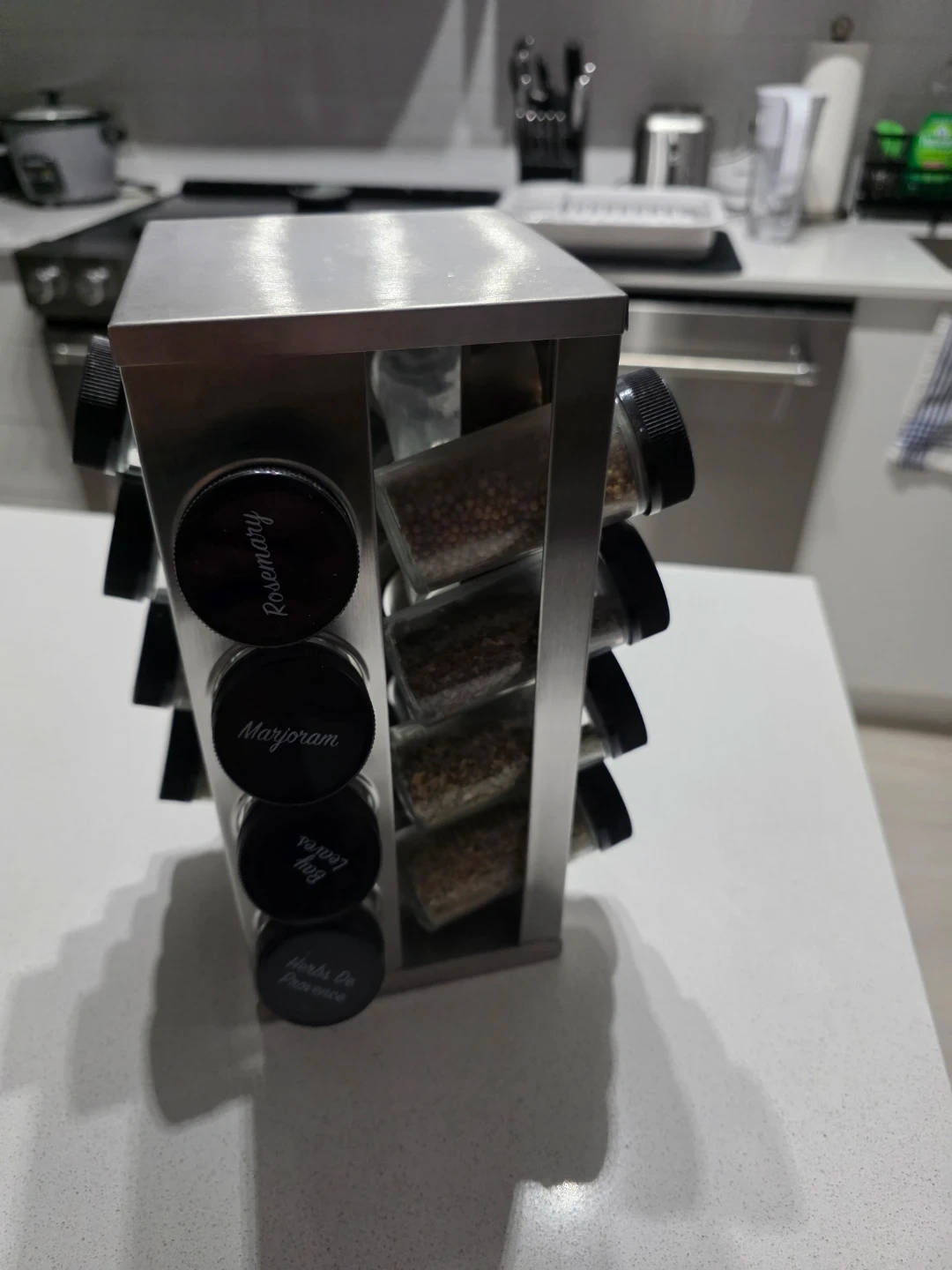 This is a 16-jar rotating spice rack, perfect for organizing your kitchen. It includes various spices like Rosemary, Oregano, and Sea Salt. The rack is made of stainless steel. The jars are labelled.