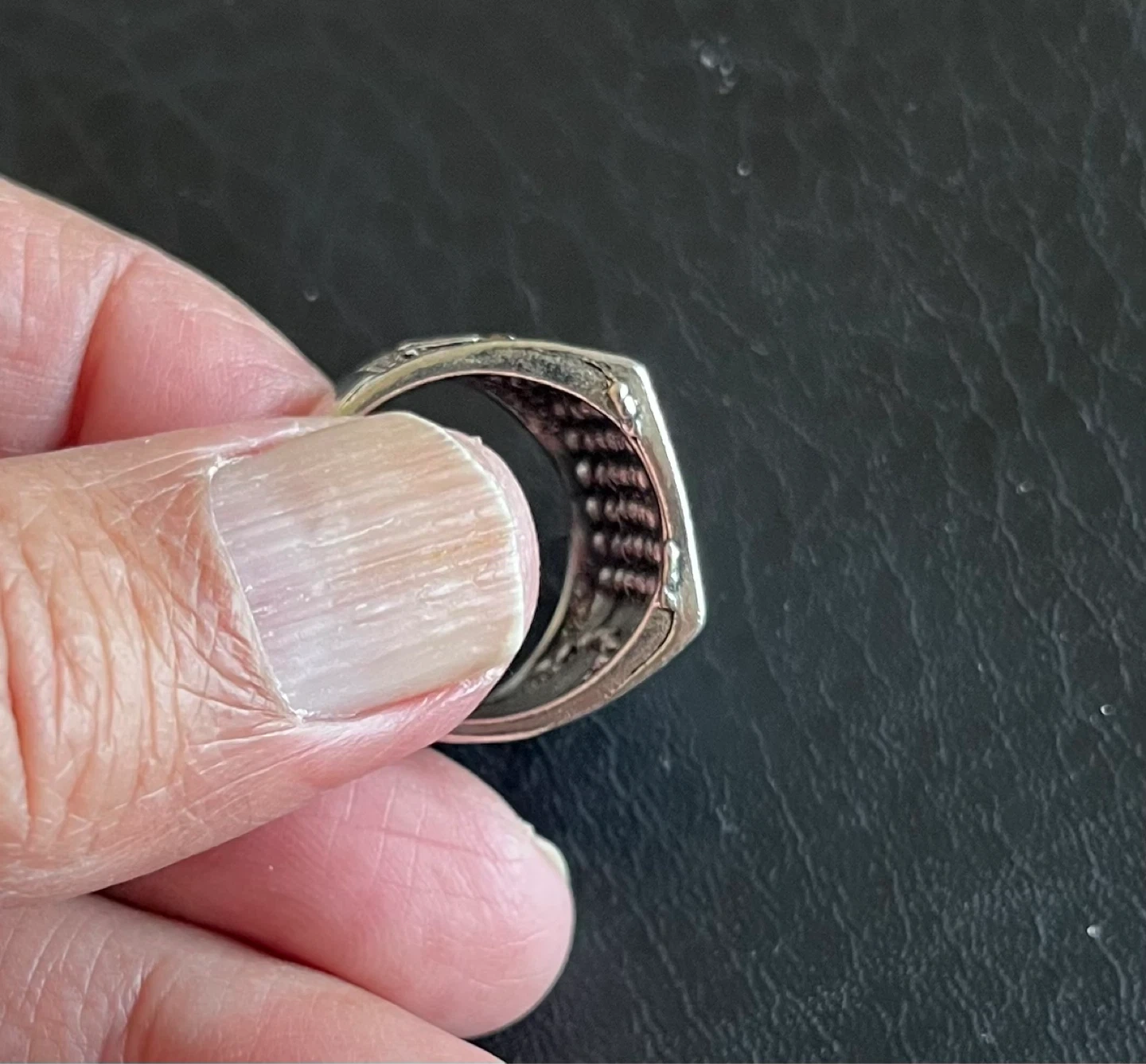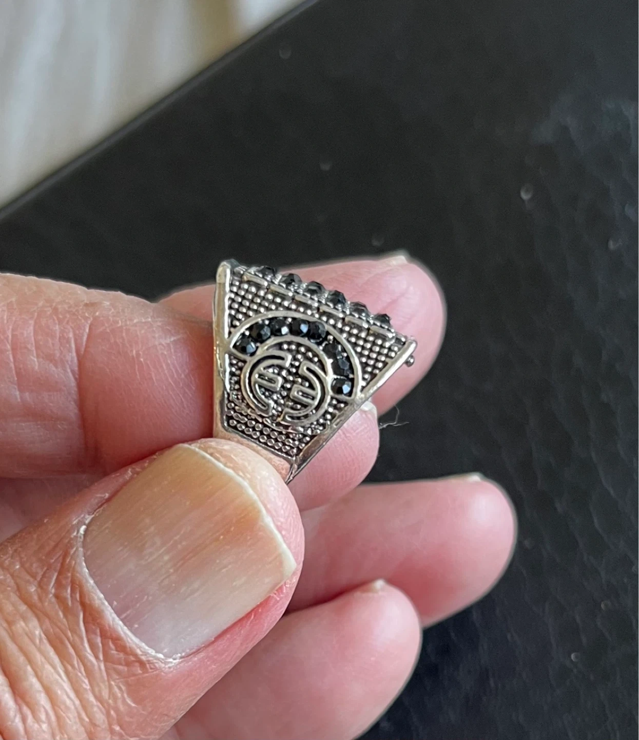 Black zarkoon not silver This men's ring features a silver-tone metal band embellished with black stones and intricate detailing. The statement design makes it a bold accessory choice. It's suitable for adding a touch of flair to any outfit.