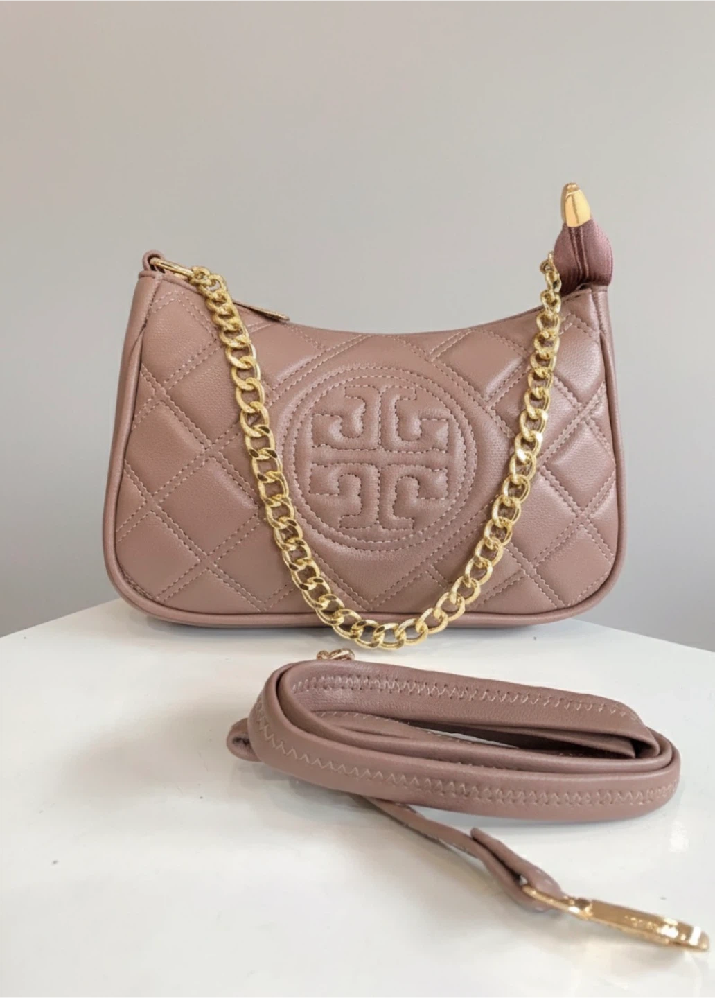 This is a beautiful Tory Burch quilted leather shoulder bag in a lovely mauve colour. It features a gold chain and a detachable shoulder strap. It's in great condition and would be a stylish addition to any outfit!