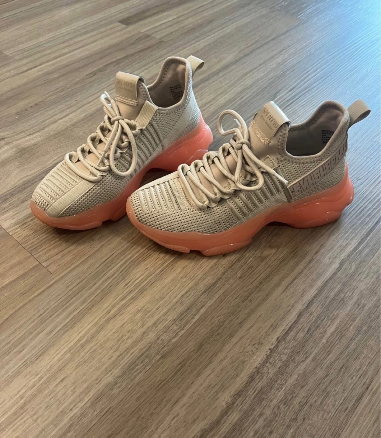 Stylish Steve Madden sneakers with a knitted upper and translucent coral sole. These kicks feature a comfortable slip-on design with laces and the signature Steve Madden logo detail on the heel. Great for everyday wear!