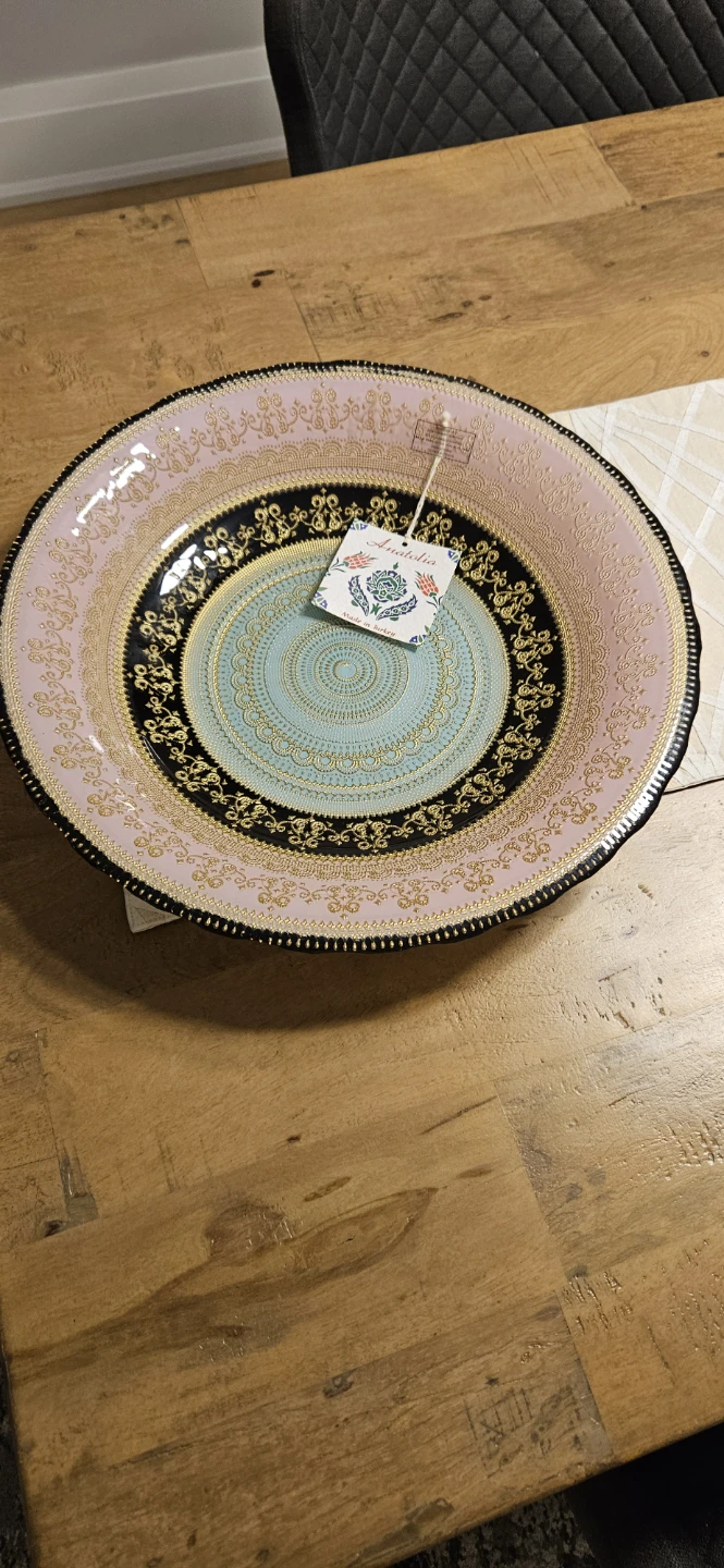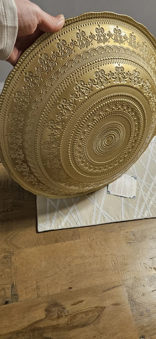 This is a beautiful decorative serving bowl with intricate detailing. It has a unique mandala-inspired pattern on the inside and a textured gold finish on the outside. Perfect for adding a touch of elegance to your table setting!