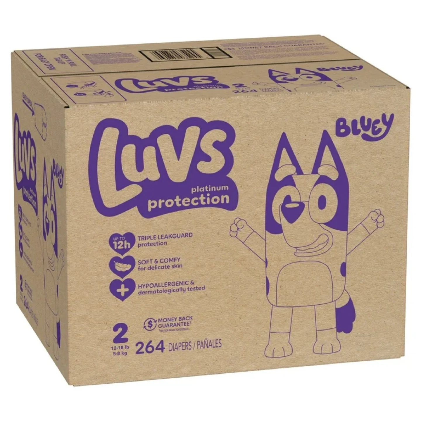 Selling a box of Luvs Platinum Protection diapers featuring Bluey! These are size 2, for babies 12-18 lbs. The box contains 264 diapers.