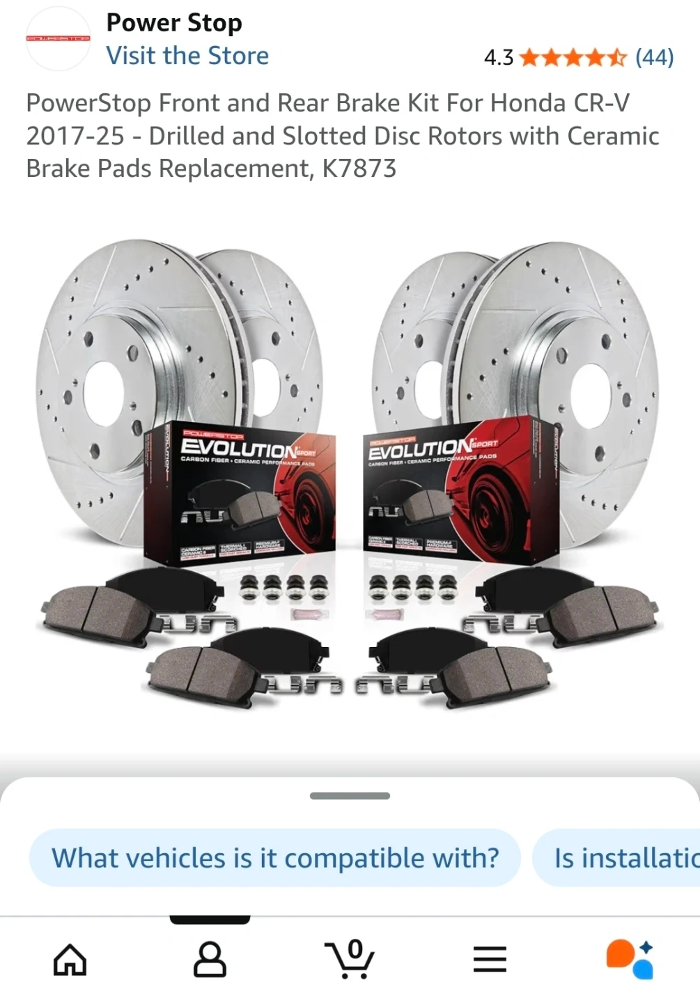 This PowerStop brake kit includes front and rear drilled and slotted rotors and carbon-fiber ceramic brake pads. It's designed for performance and low dust. The kit is for a Honda CR-V 2017-2025 and comes with premium hardware.