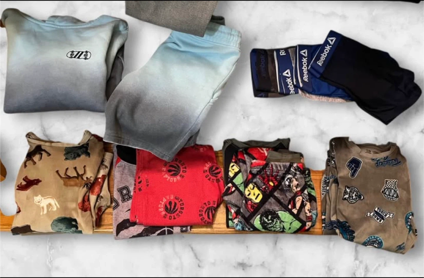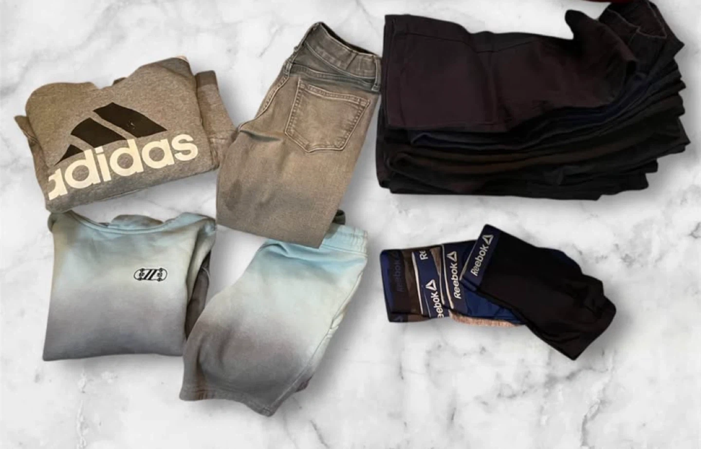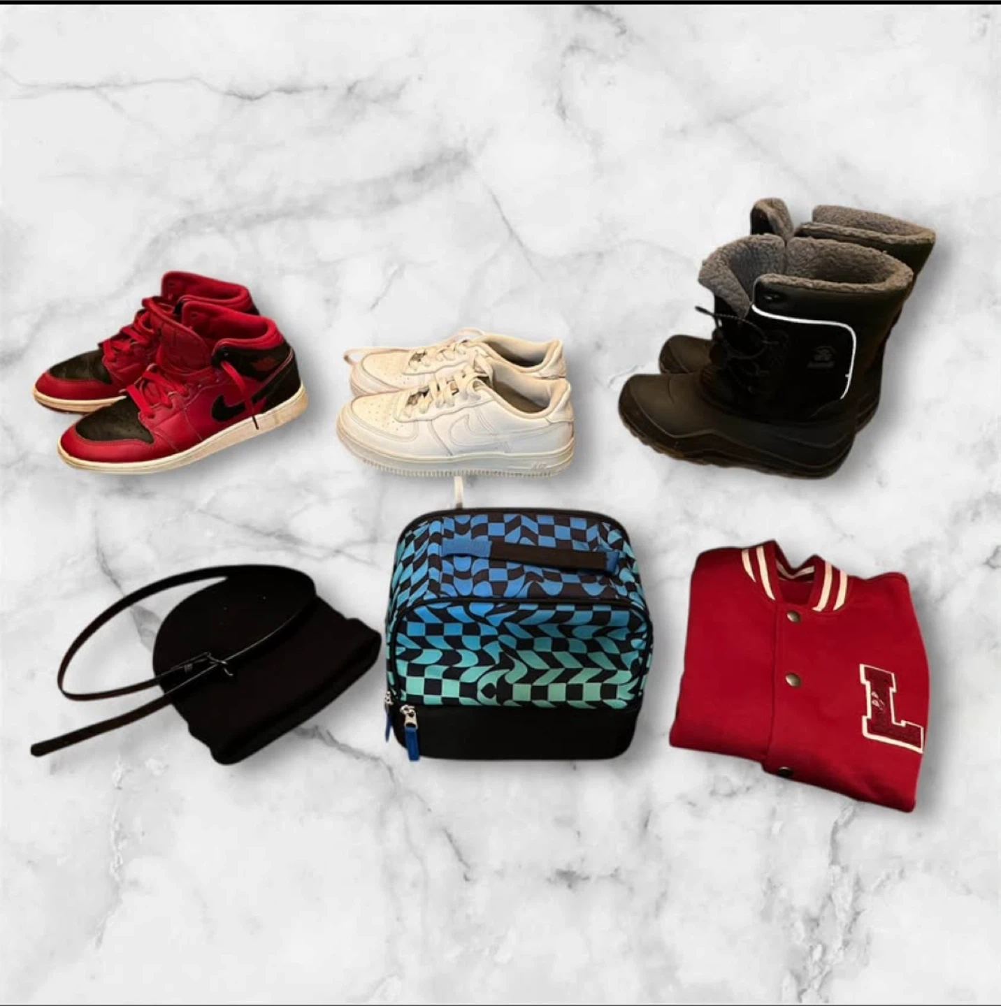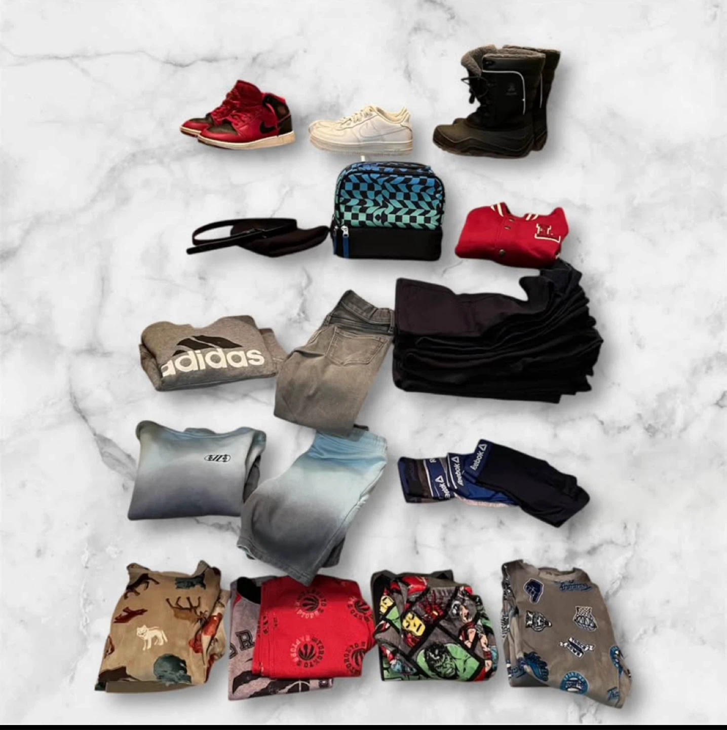 Shoes, boots, lunch bag, pants, sweaters, pjs and Reebok underwears.