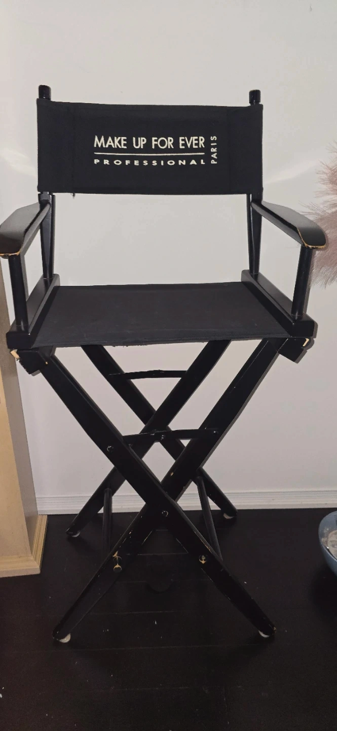 A MAKE UP FOR EVER Professional director's chair. It's black with wooden accents on the arms. Great for makeup artists!. There is no foot rest and as you can see, there are scrathes. If you can and want to fix it up, its yours