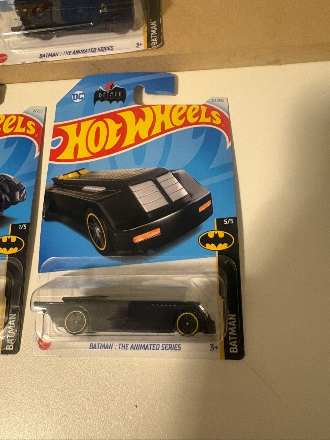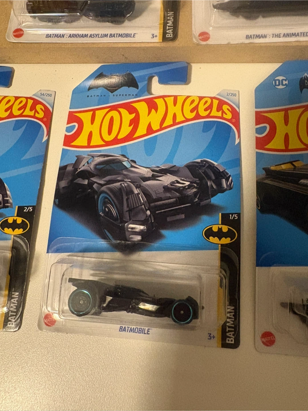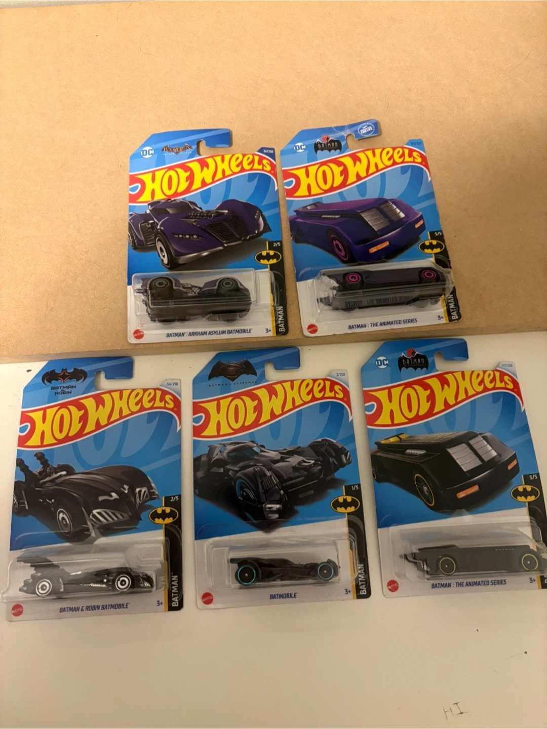 A collection of Hot Wheels die-cast Batmobiles from the Batman series. All pf the cars are sealed in their original packaging and I am selling them as a BUNDLE. All 5 cars for $25 but i am welcome to offers.