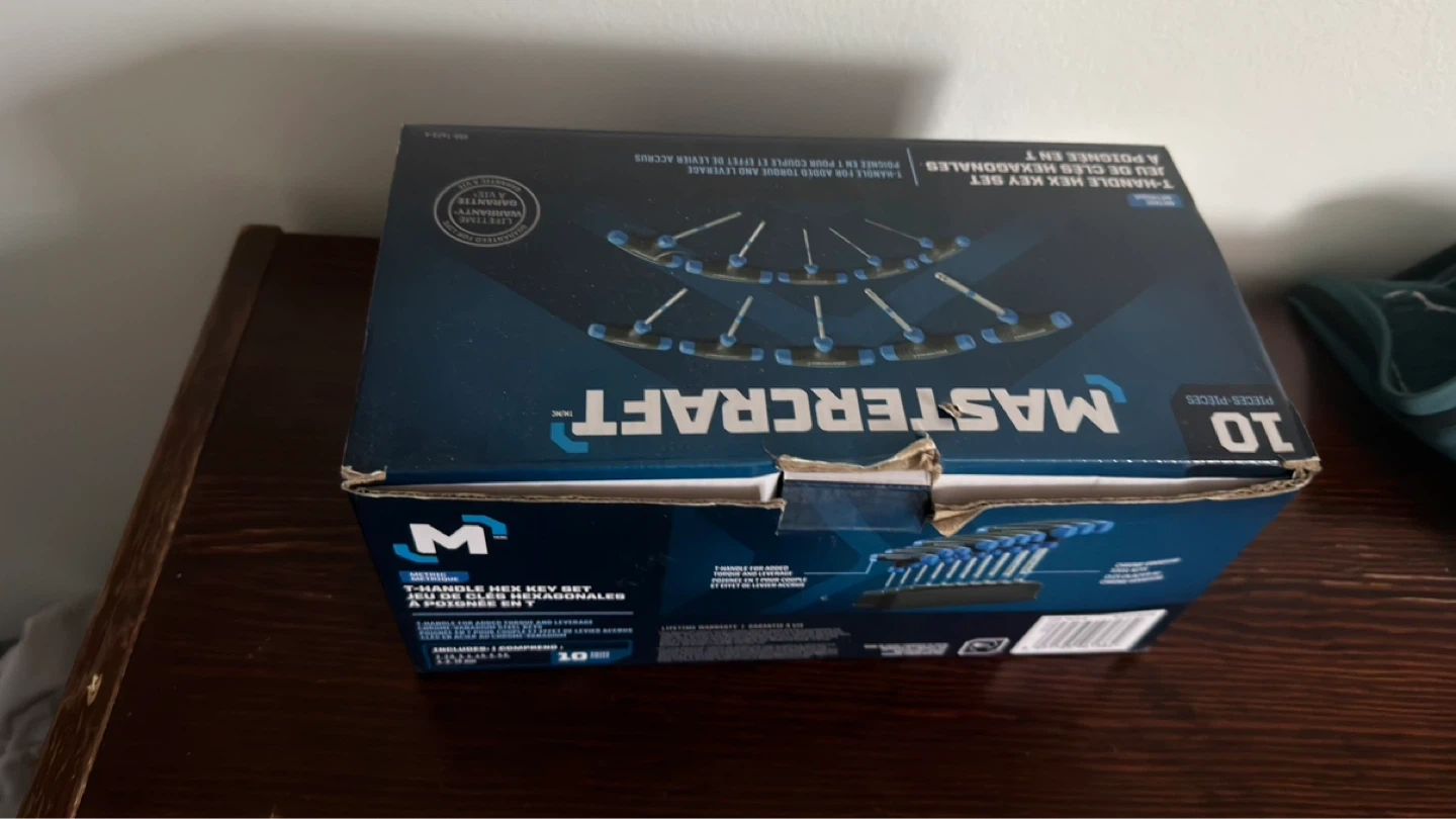 This is a 10-piece Mastercraft T-handle hex key set. Includes various sizes with blue and black handles. Comes with a holder insert. Great for mechanics and DIYers!