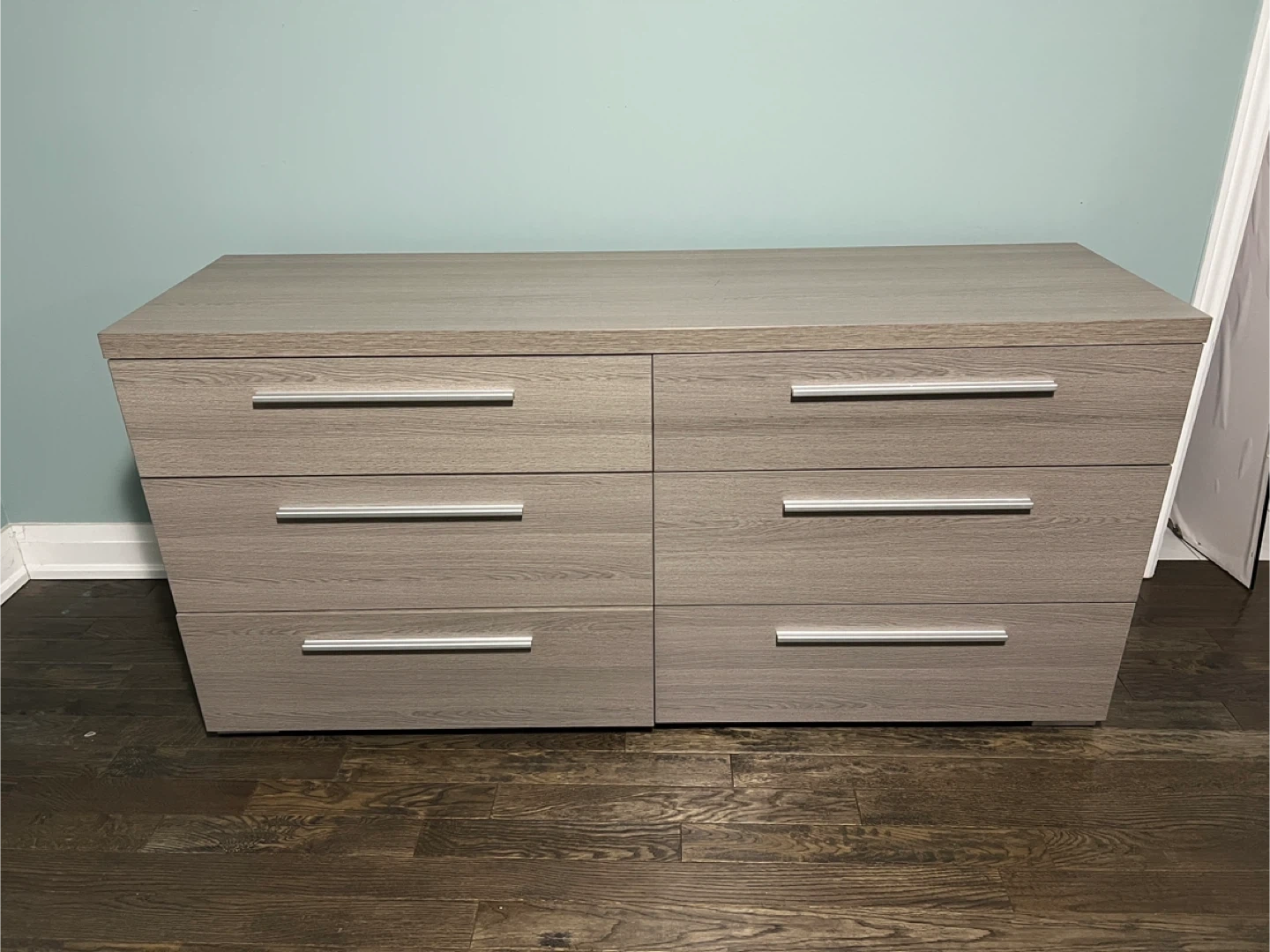 This dresser features a light oak finish and six spacious drawers with sleek silver handles. It's made from engineered wood. The dresser measures approximately 64 inches wide, 20 inches deep, and 30 inches high. It's a practical storage solution for any bedroom!