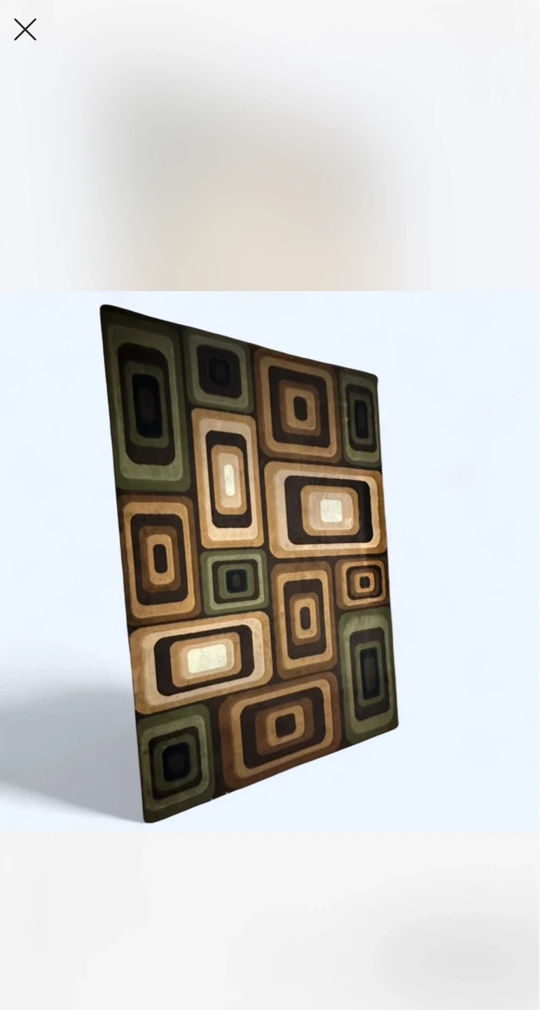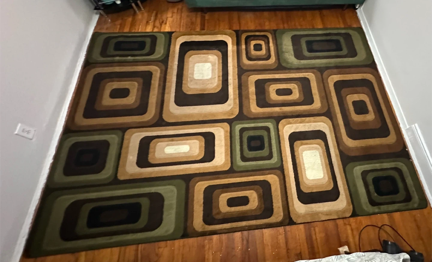 This rug features a cool retro design with brown and green tones! It would be a great addition to any room needing a vintage touch. The rug is in good condition and ready to enhance your home decor.