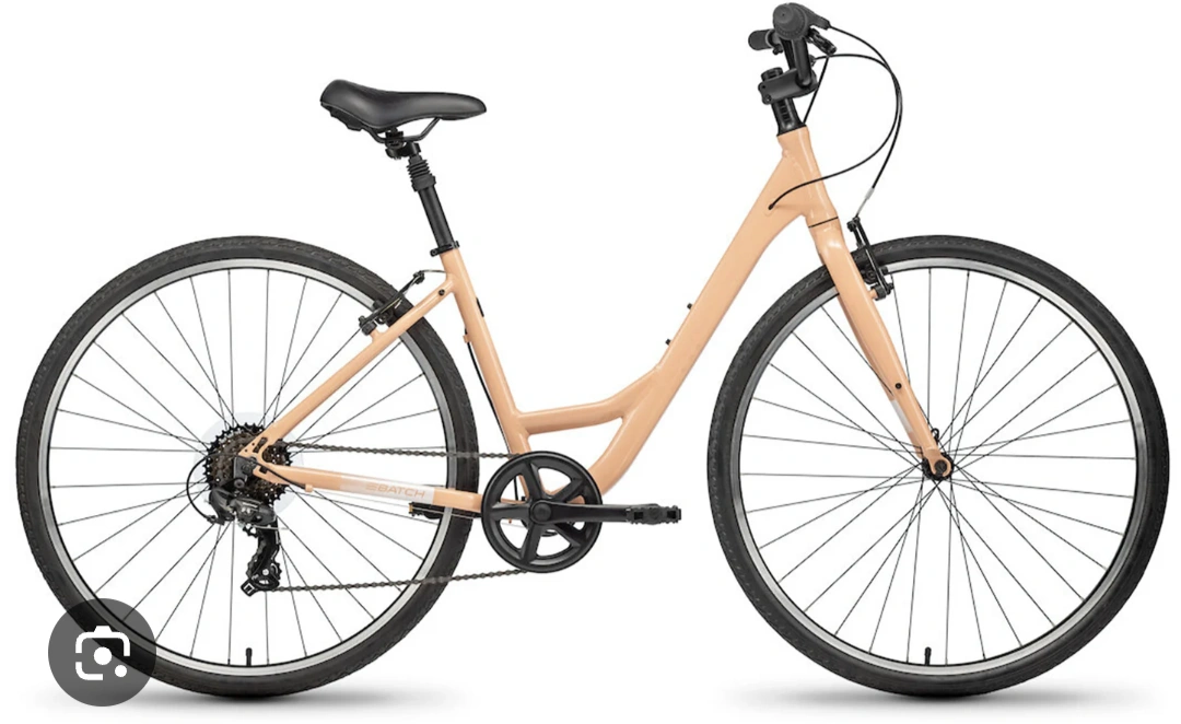 Selling a Batch step-through hybrid bike in a lovely peach colour! It's a great bike for getting around town or enjoying a leisurely ride. It appears to be in good condition and ready for a new owner to enjoy.