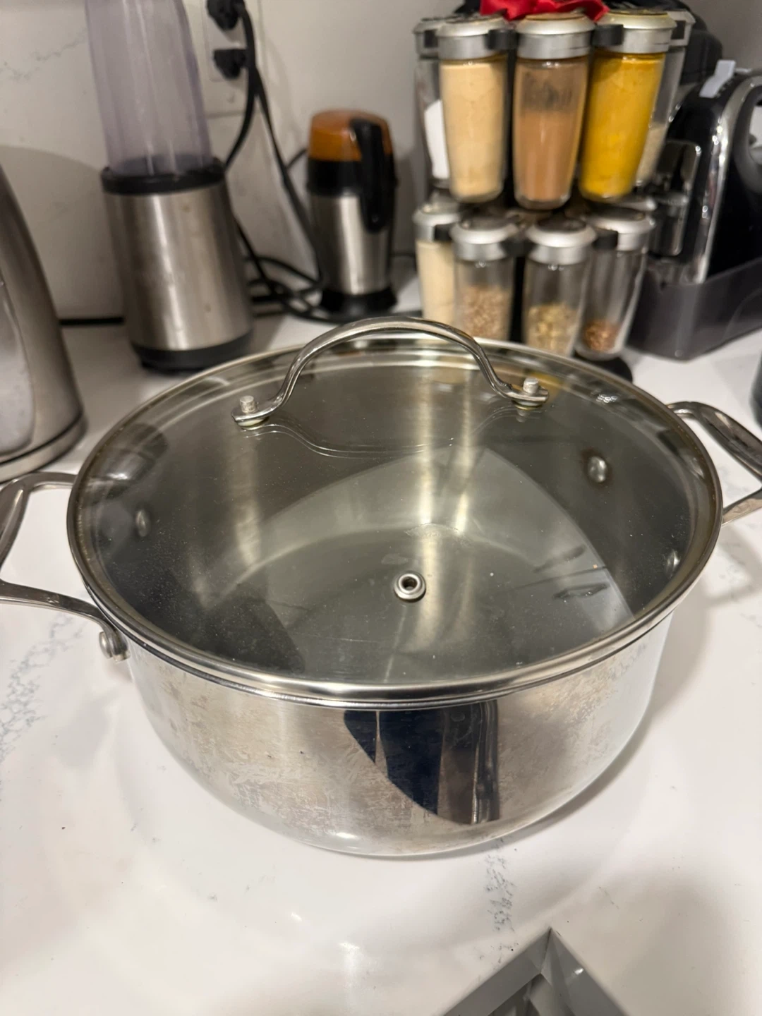 This is a stainless steel cooking pot with a clear glass lid. It has two side handles for easy gripping. It's a good size for stews or soups.