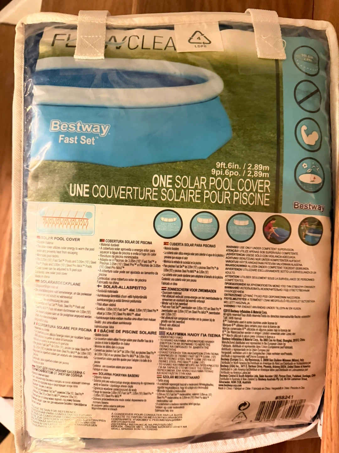 This is a Bestway Fast Set solar pool cover for pools up to 9ft 6in (2.89m). It helps warm the pool water using solar energy. It's designed to reduce water evaporation and keep debris out.