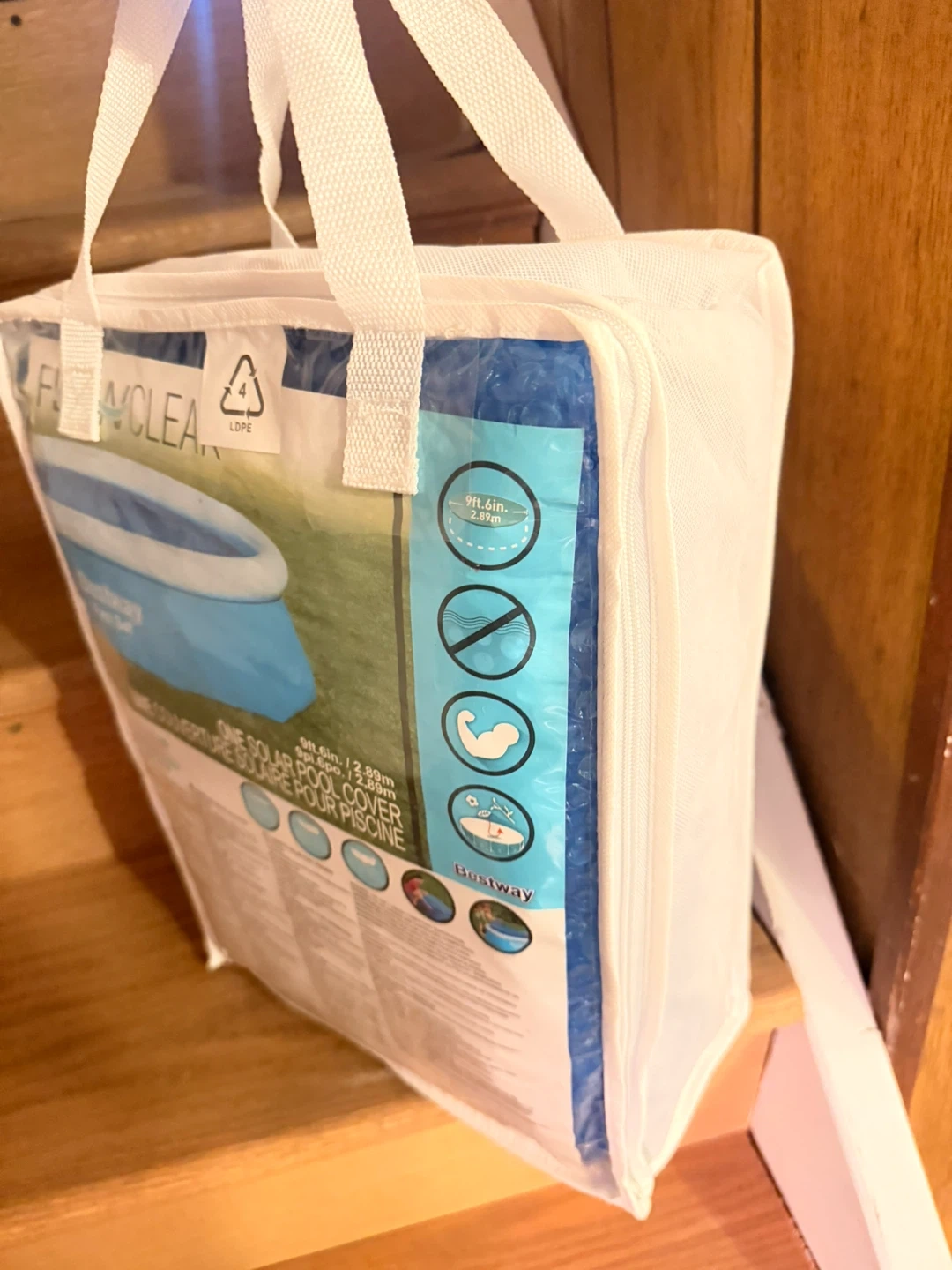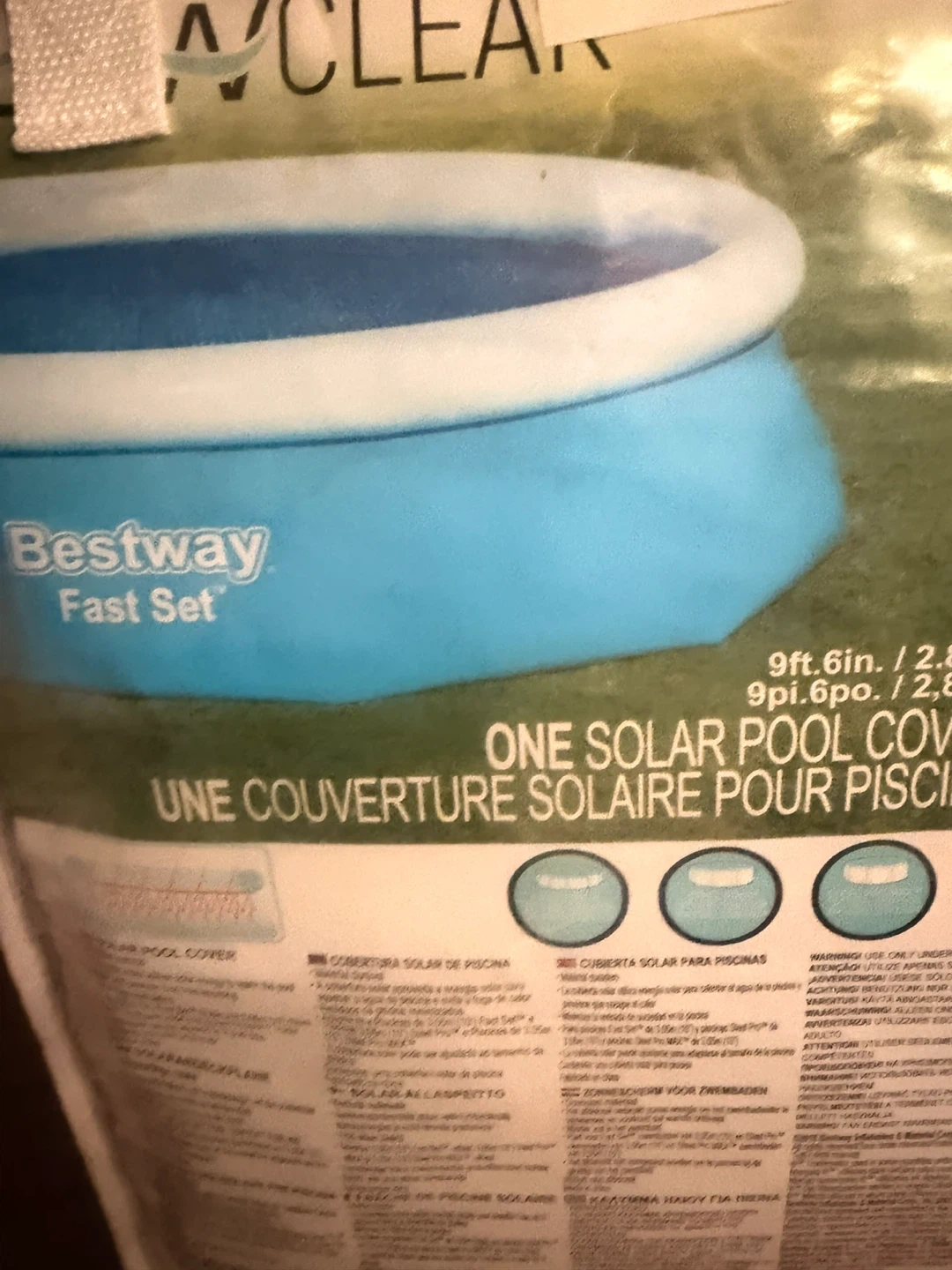 This is a Bestway Fast Set solar pool cover for pools up to 9ft 6in (2.89m). It helps warm the pool water using solar energy. It's designed to reduce water evaporation and keep debris out.
