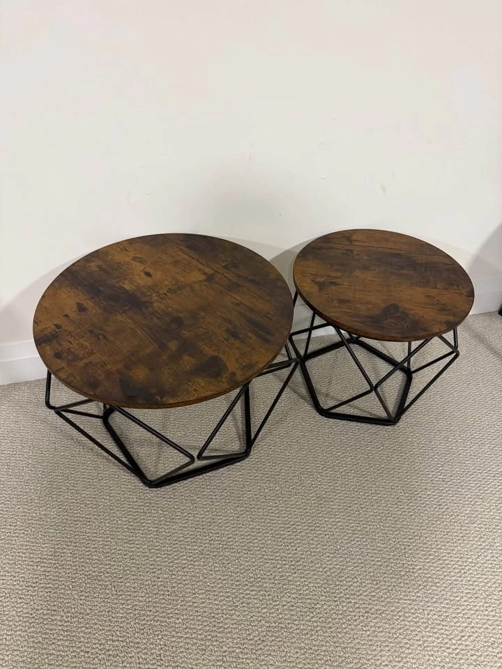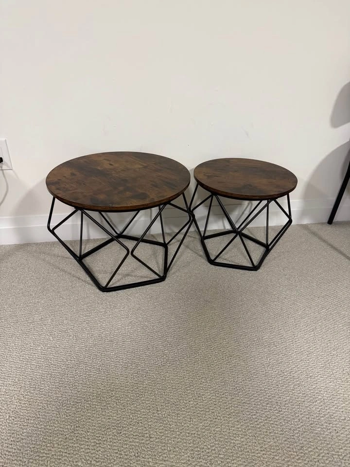 Brand new set of two wood side tables, one larger than the other. Both feature wooden tops with metal supporting bars. The wooden tops are easily removable. The larger table is 19.7" wide and 15.7" tall. The smaller table is 15.7" wide and 14.2" tall. Selling both as a pair, but open to selling them individually. Feel free to message if you have any questions!