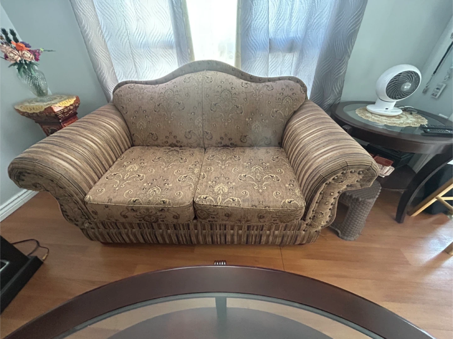 This living room set includes a three-seater sofa and a two-seater loveseat. Upholstered in a brown fabric with a damask floral pattern. Features ornate rolled arms and studded trim. Offers comfortable seating for your home.