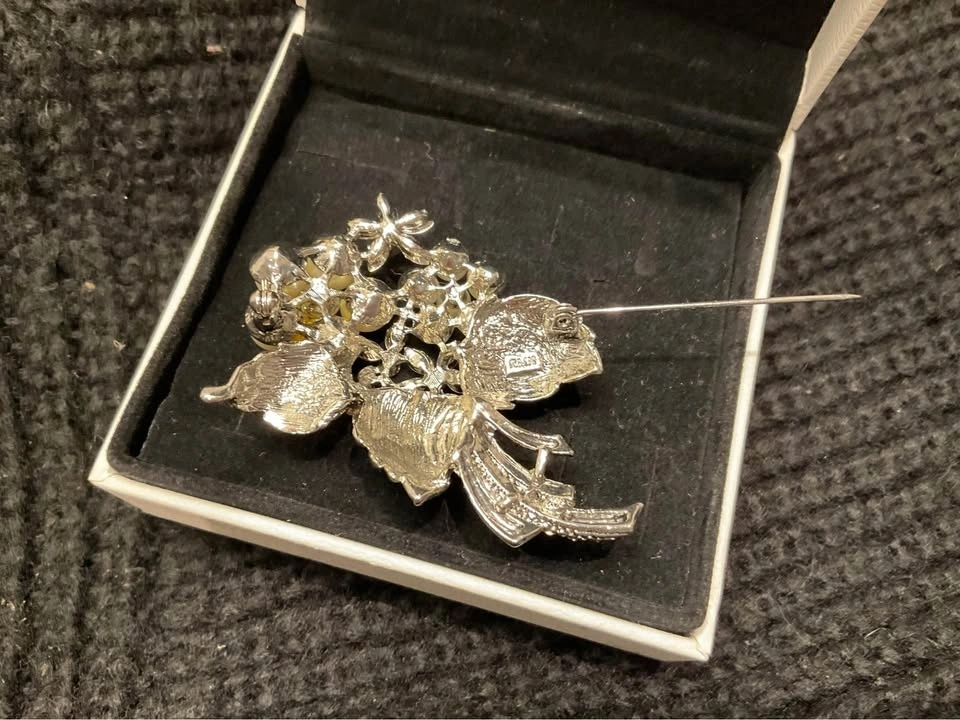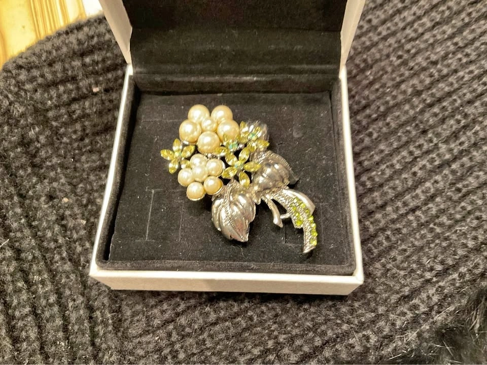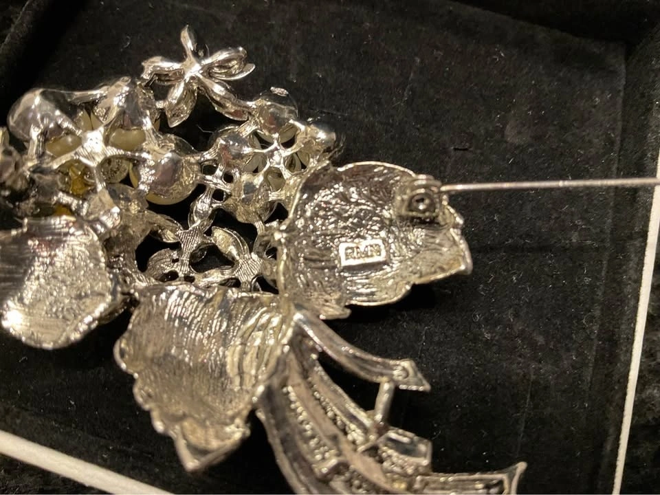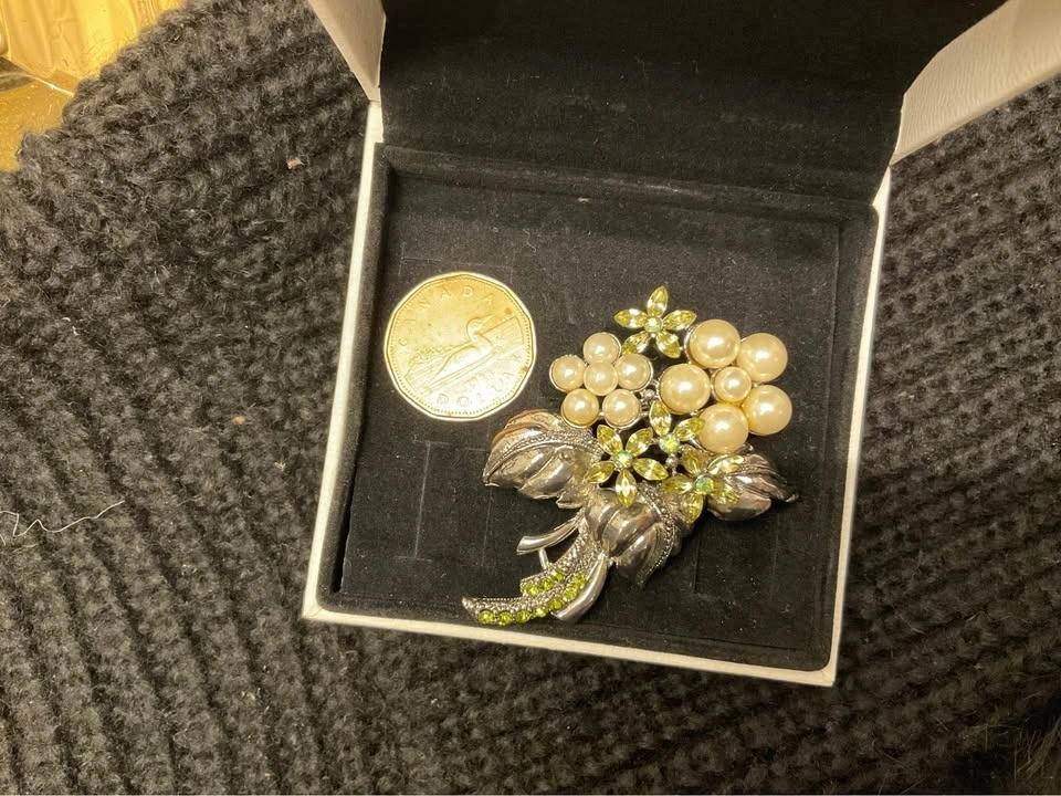 Stunning Vintage RMN (Roman Company) Ladies Brooch with faux pearls and Austrian crystals from the 1970s. From a smoke & pet-free home. #366/800. Available in Richmond Hill near Bathurst & King Rd.