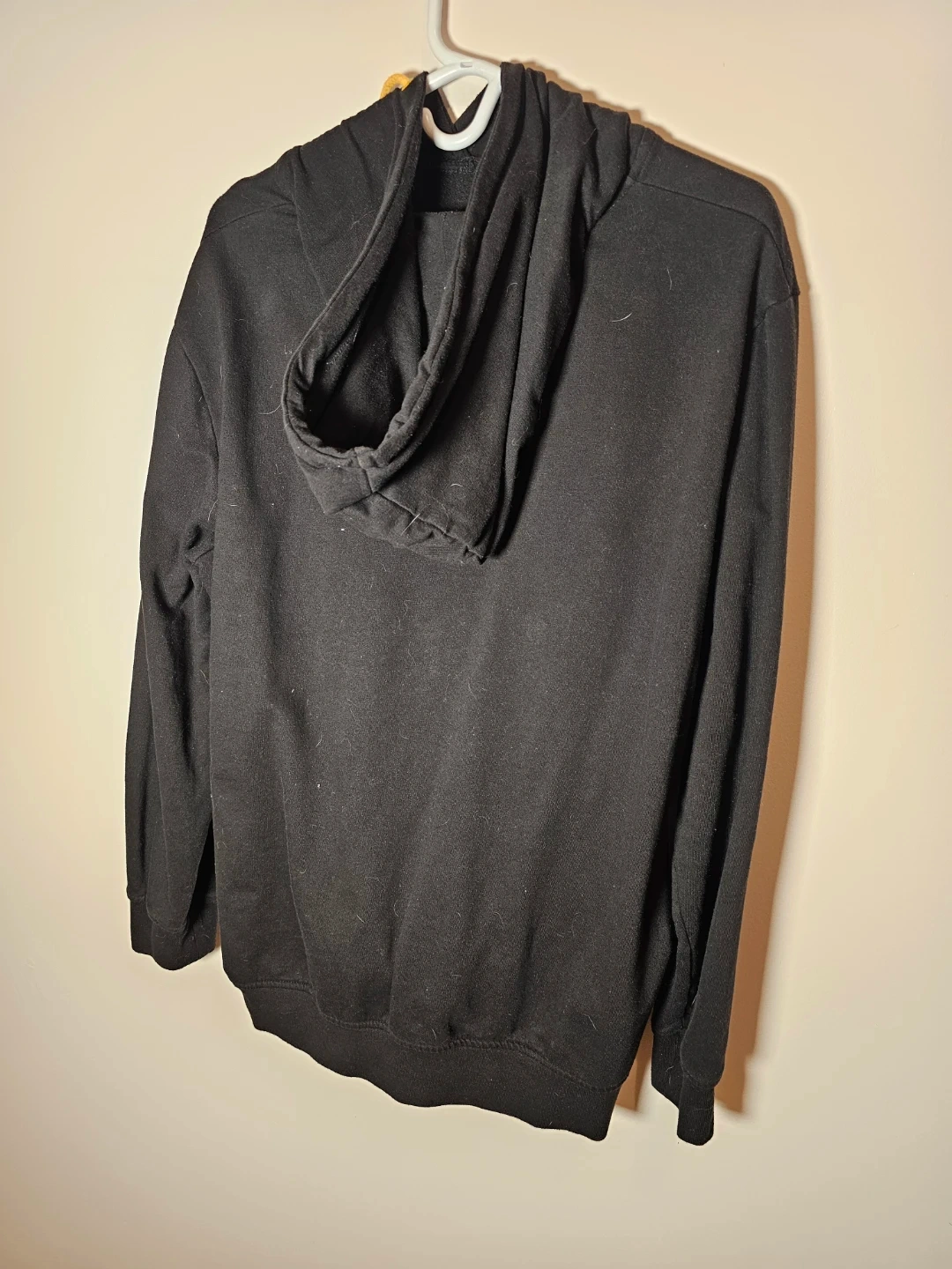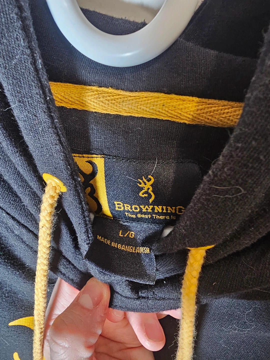 This is a Browning black hoodie in size L/G. It's made in Bangladesh and features a yellow logo and drawstrings. This hoodie is great for casual wear or outdoor activities.