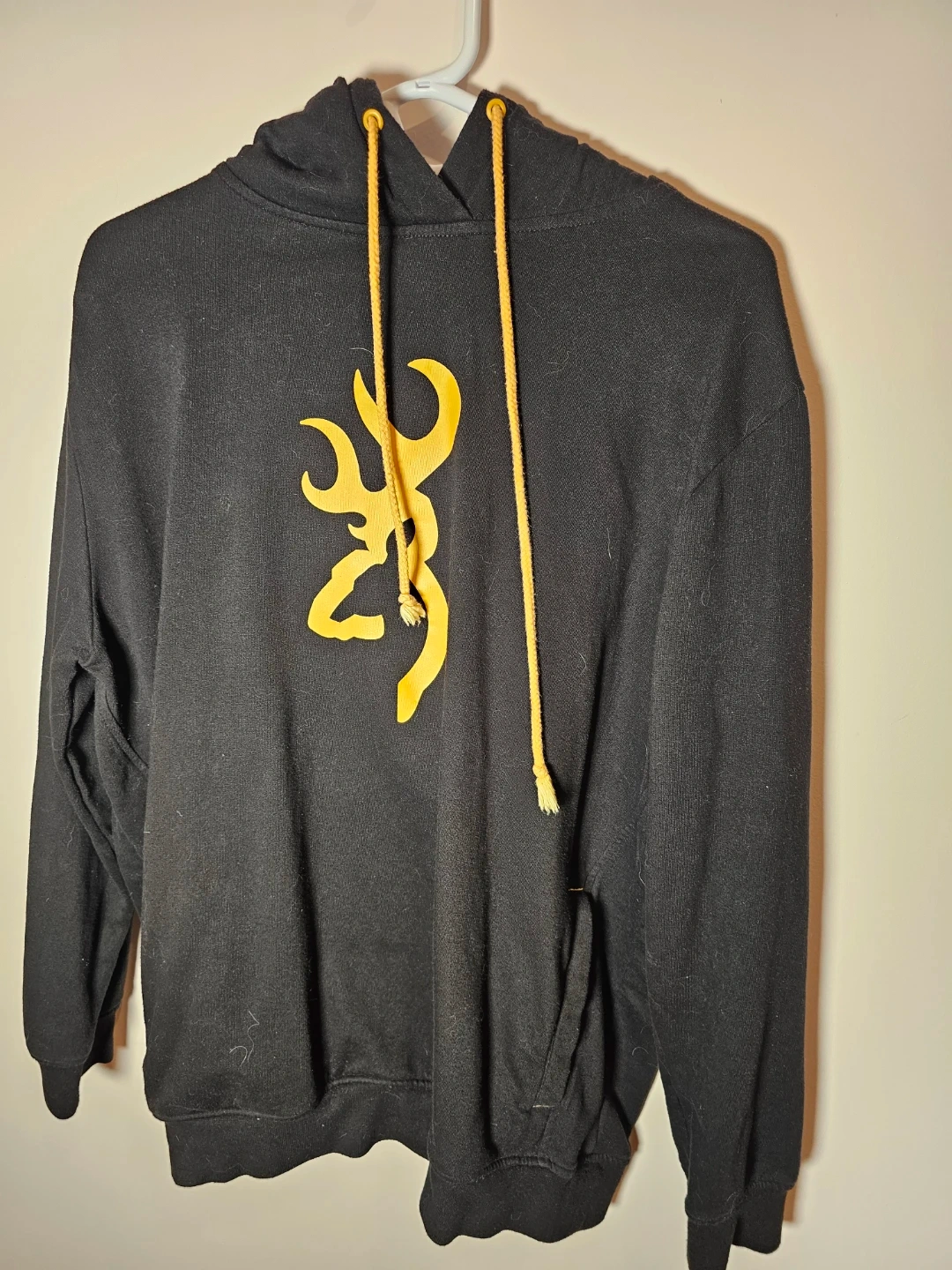 This is a Browning black hoodie in size L/G. It's made in Bangladesh and features a yellow logo and drawstrings. This hoodie is great for casual wear or outdoor activities.