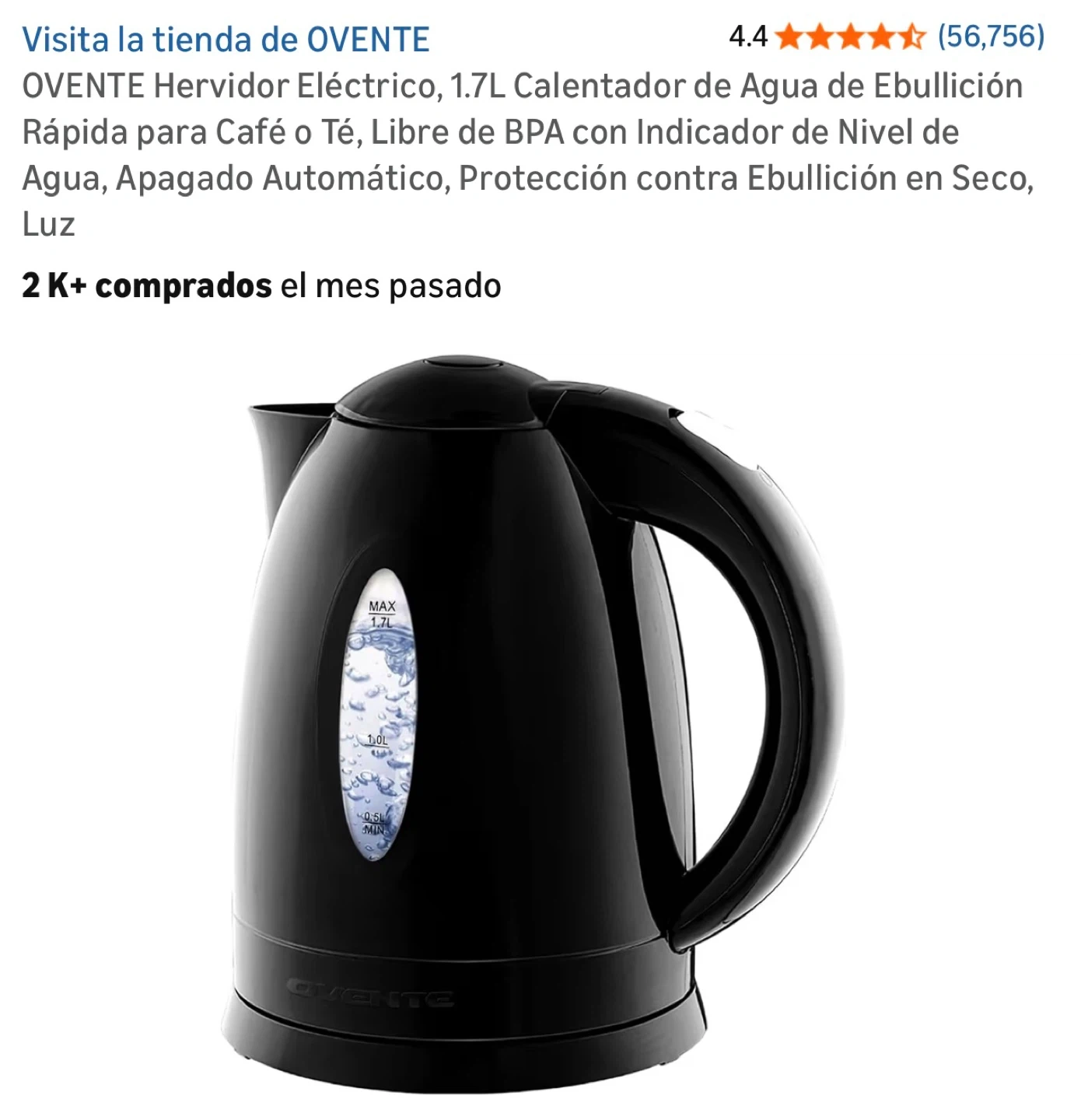 This is an OVENTE electric kettle with a 1.7L capacity. It's BPA-free and features an auto shut-off function. The kettle also has a water level indicator and dry boil protection.