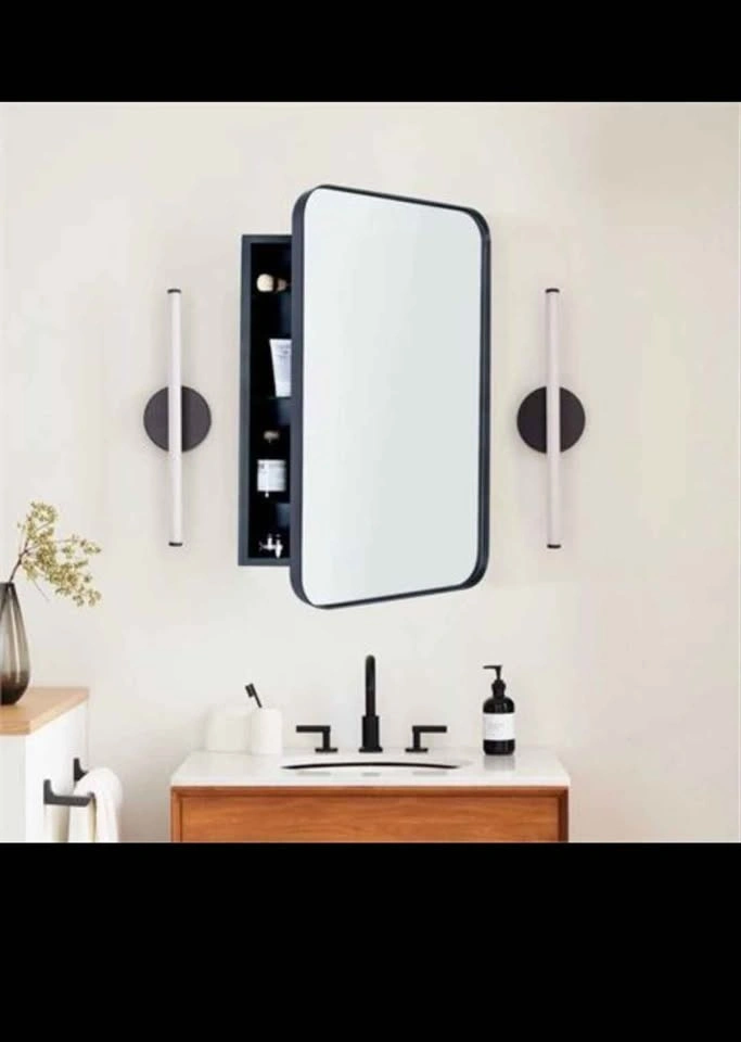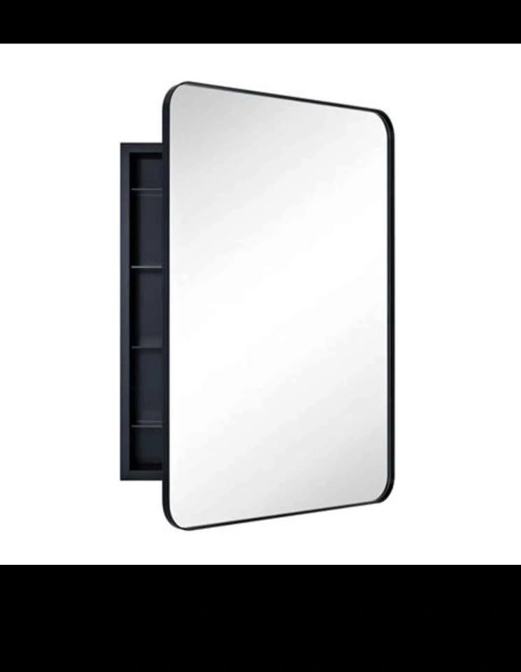 Brand new medicine cabinet with mirror. Bought for bathroom reno but changed plans. Has sleek rounded corners and designed for recess mount. Internal shelving for storage. Overall dimensions are 24 inches wide by 36 inches high by 5 inches deep.