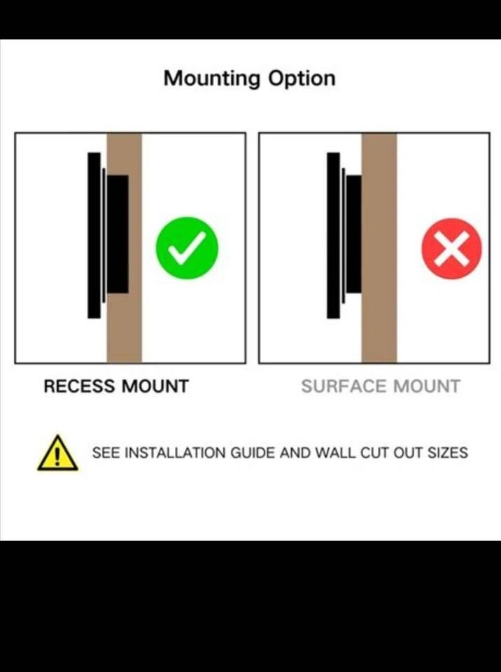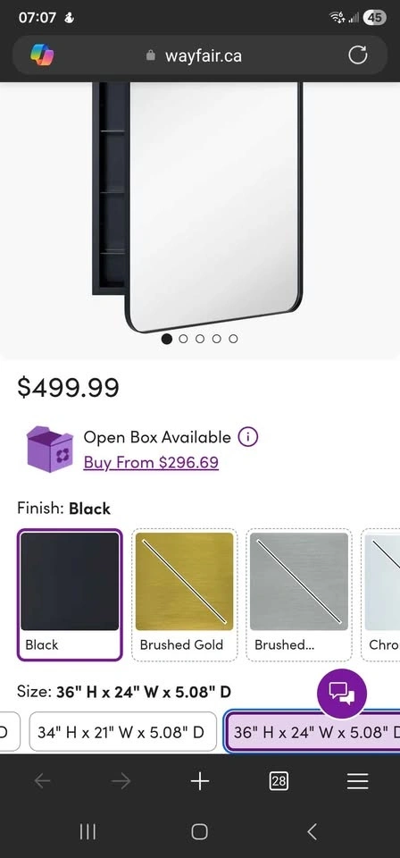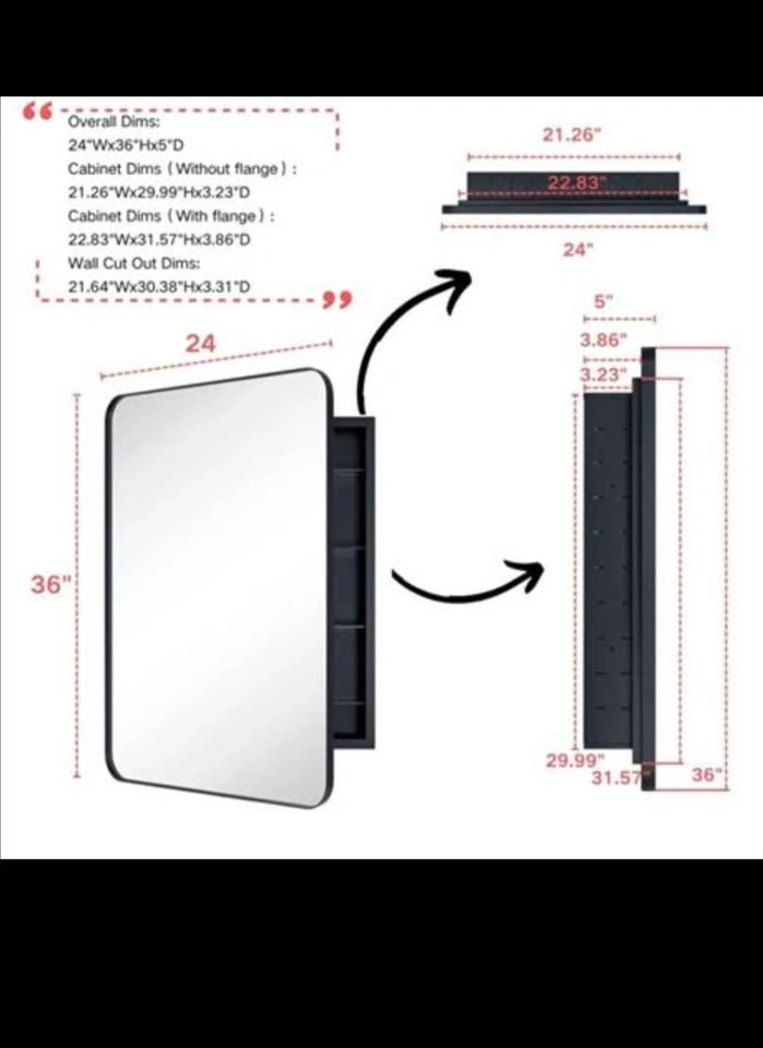 Brand new medicine cabinet with mirror. Bought for bathroom reno but changed plans. Has sleek rounded corners and designed for recess mount. Internal shelving for storage. Overall dimensions are 24 inches wide by 36 inches high by 5 inches deep.