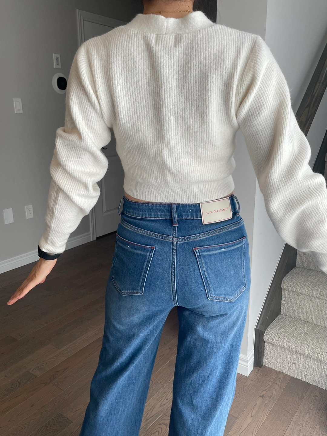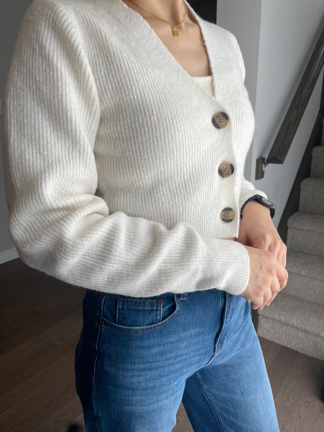Creamy white ribbed knit cropped cardigan with button front closure. Long sleeves with puffed shoulders. Material feels soft and cozy. It's a stylish layer for any outfit!