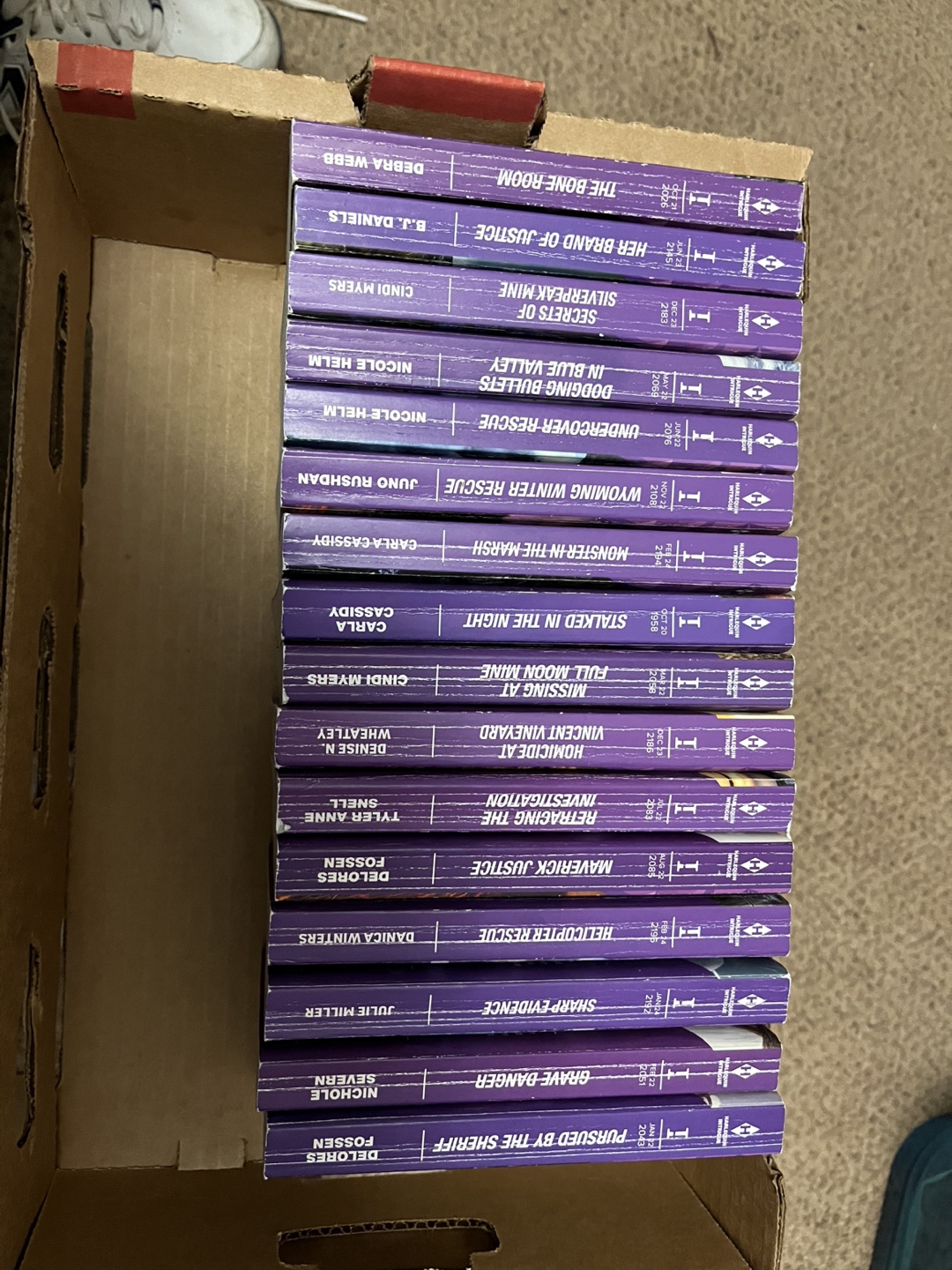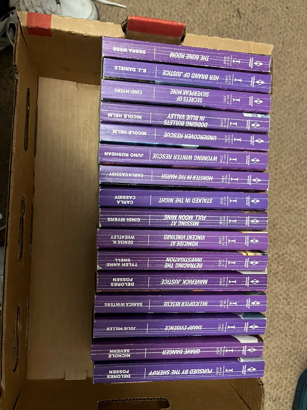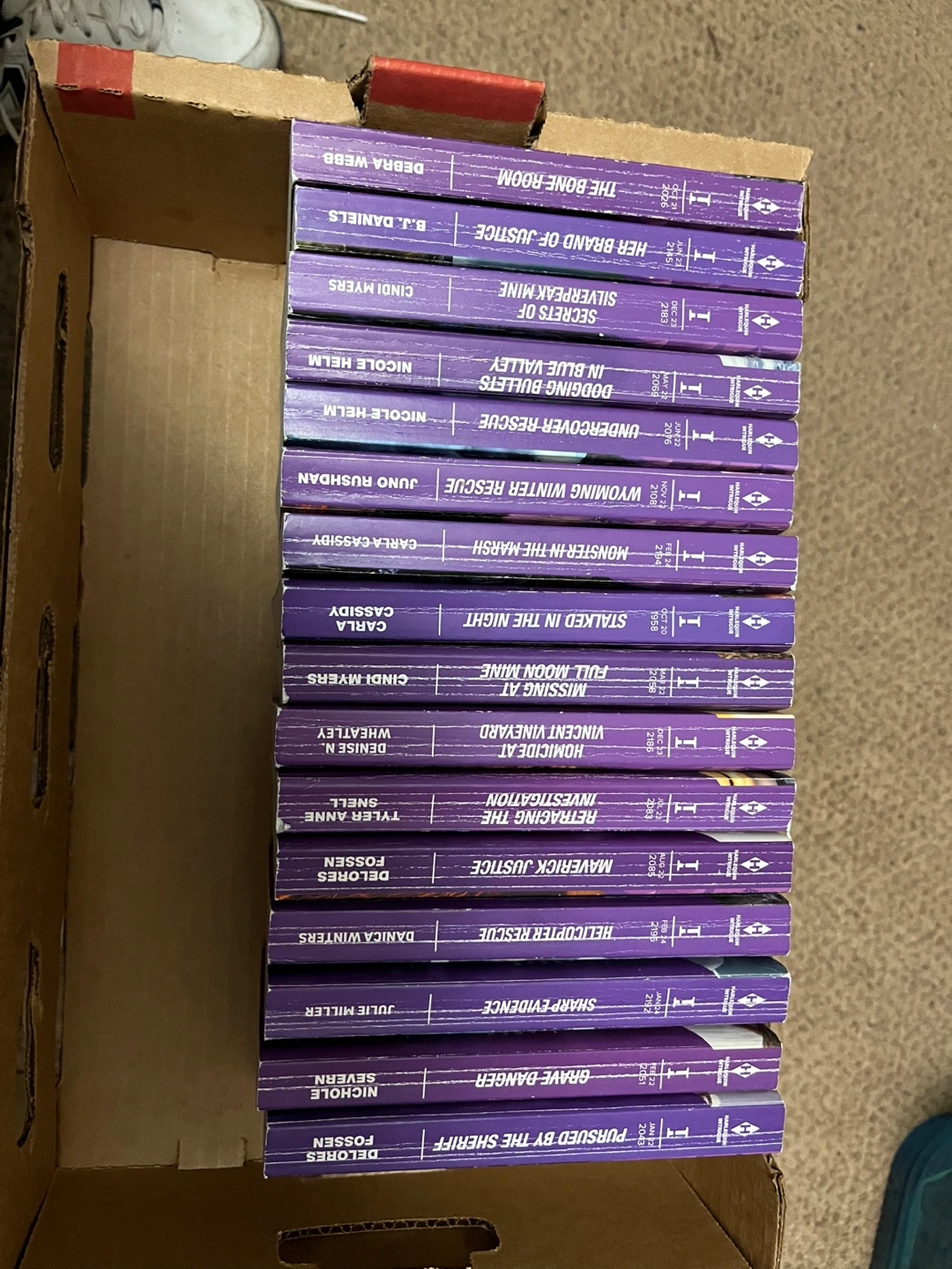 Set of 20 Intrigue novels. Mass market paperbacks. Authors include: Delores Fossen, Julie Miller, Danica Winters, Tyler Anne Snell, Denise N. Wheatley, Cindi Myers, Carla Cassidy, Juno Rushdan, Nicole Helm, B.J. Daniels, Debra Webb.